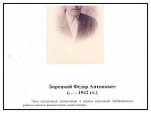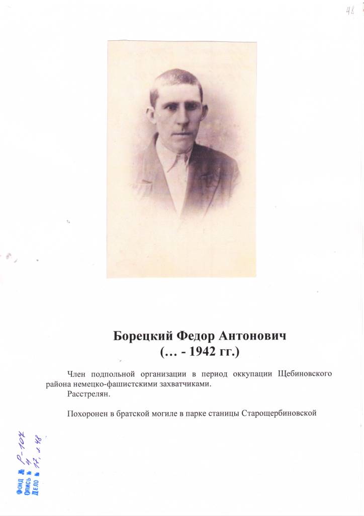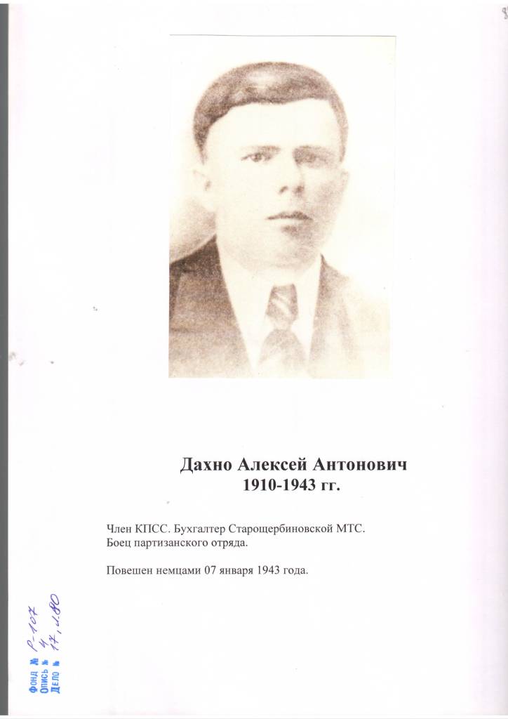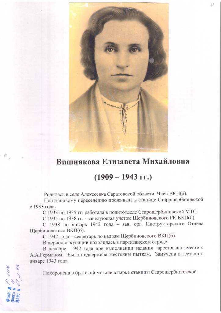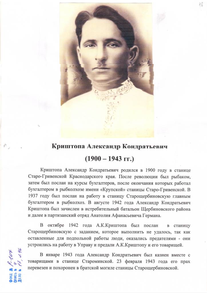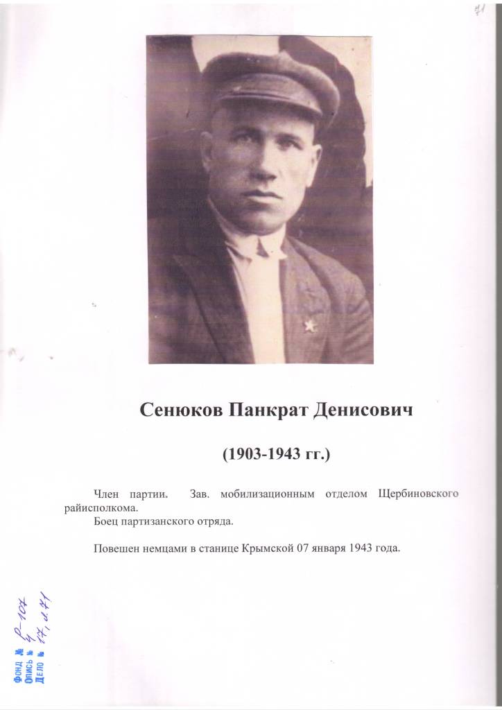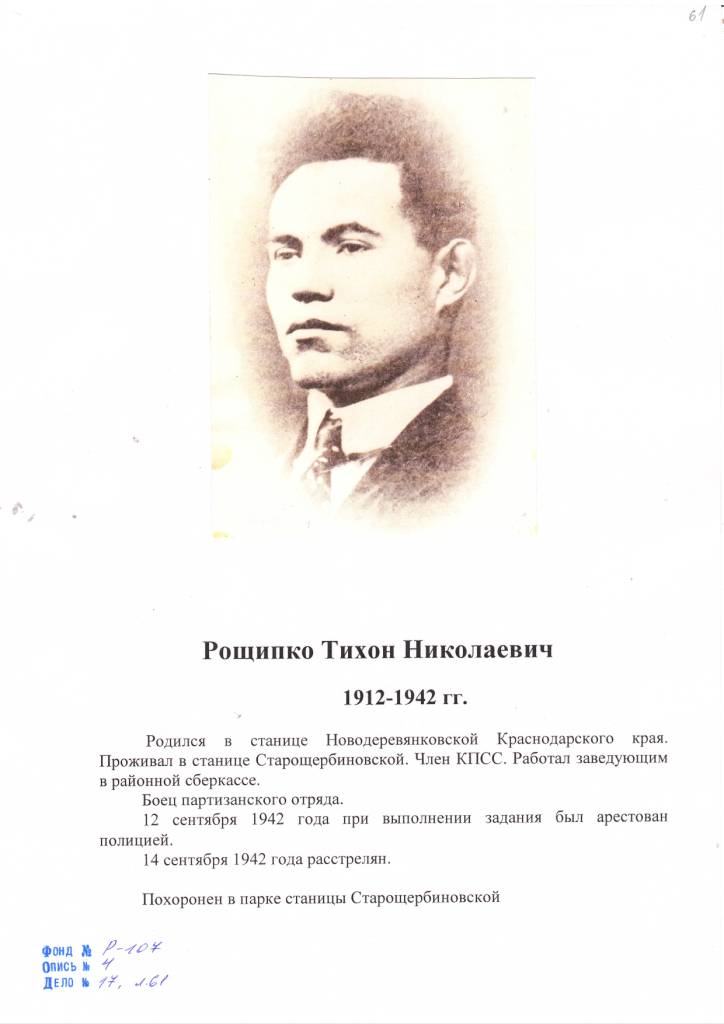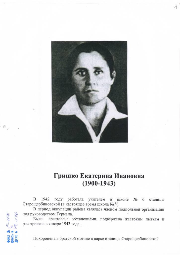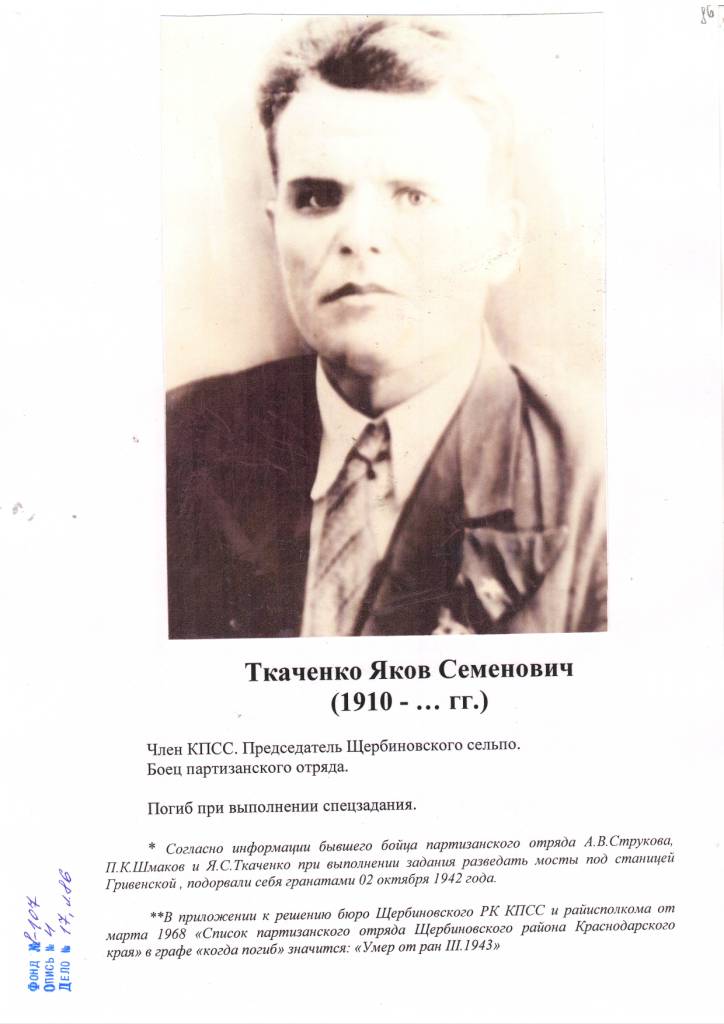 В июле 1942 года (перед оккупацией) в Щербиновском районе был создан партизанский отряд из 65 человек. Он состоял из членов партийно – хозяйственного актива, оставленного для работы в тылу. Отряд входил в Анапское партизанское соединение. Командиром отряда был Михаил Гаврилович Клешнев, комиссаром Василий Иванович Сальский, командиром разведки Анатолий Афанасьевич Герман (в приложении представлены документы, фотографии, информации о партизанском отряде нашего района).
