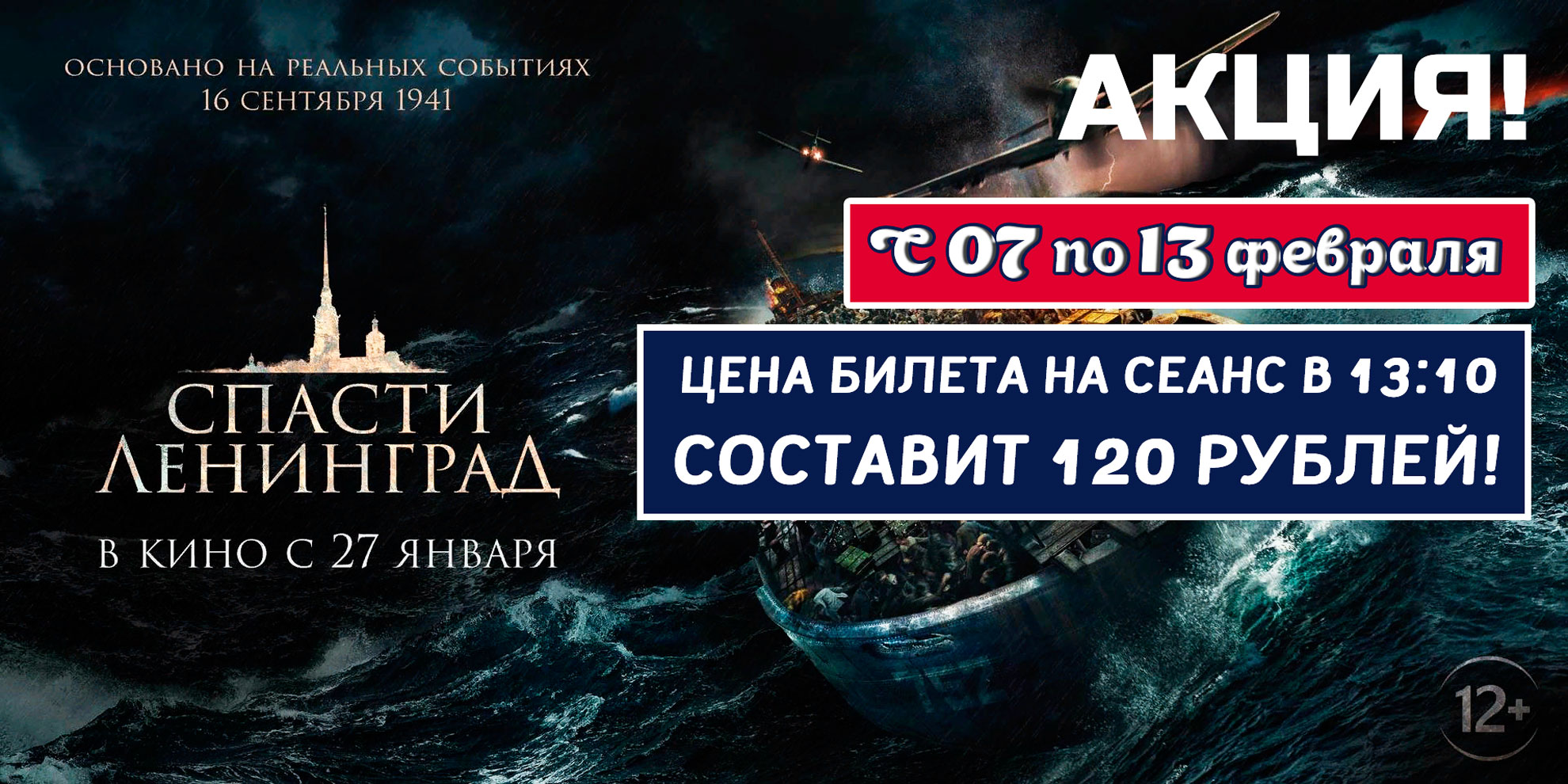 Ежедневно с 7 по 13 февраля в 13:10 цена билета на сеанс с фильмом "Спасти Ленинград" составит 120 р.