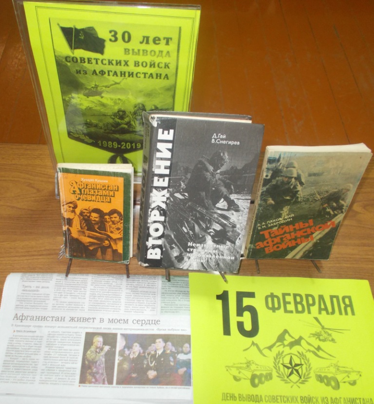 К мероприятию был подготовлен открытый просмотр литературы «Афганская война…», где были представлены книги, периодические издания о подвигах и судьбах участников афганской войны. Минутой молчания почтили память погибших в этой войне.