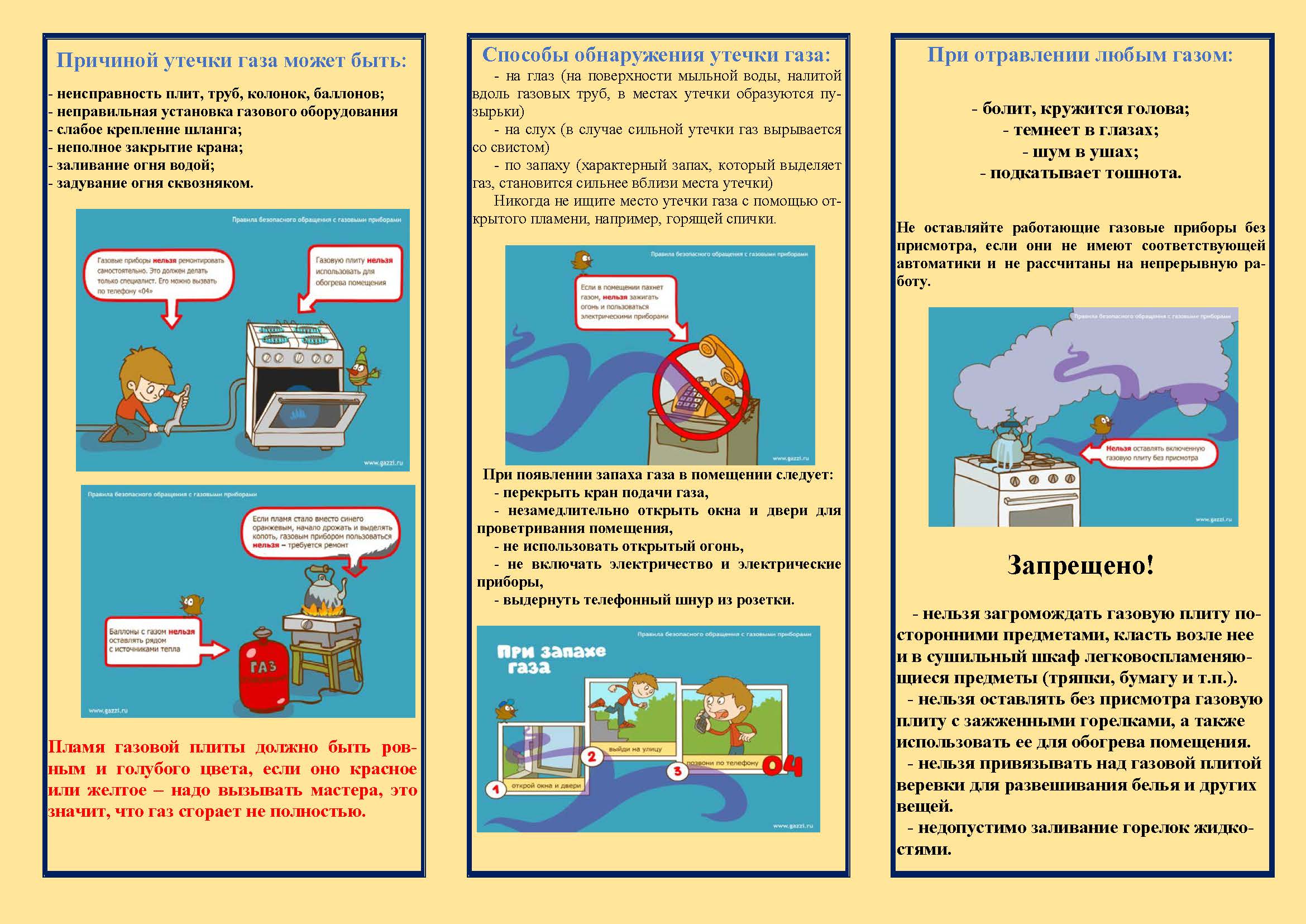 Помни: почувствовав запах газа (во избежание его взрыва), не включай освещение, не зажигай спичек, не применяй открытый огонь!