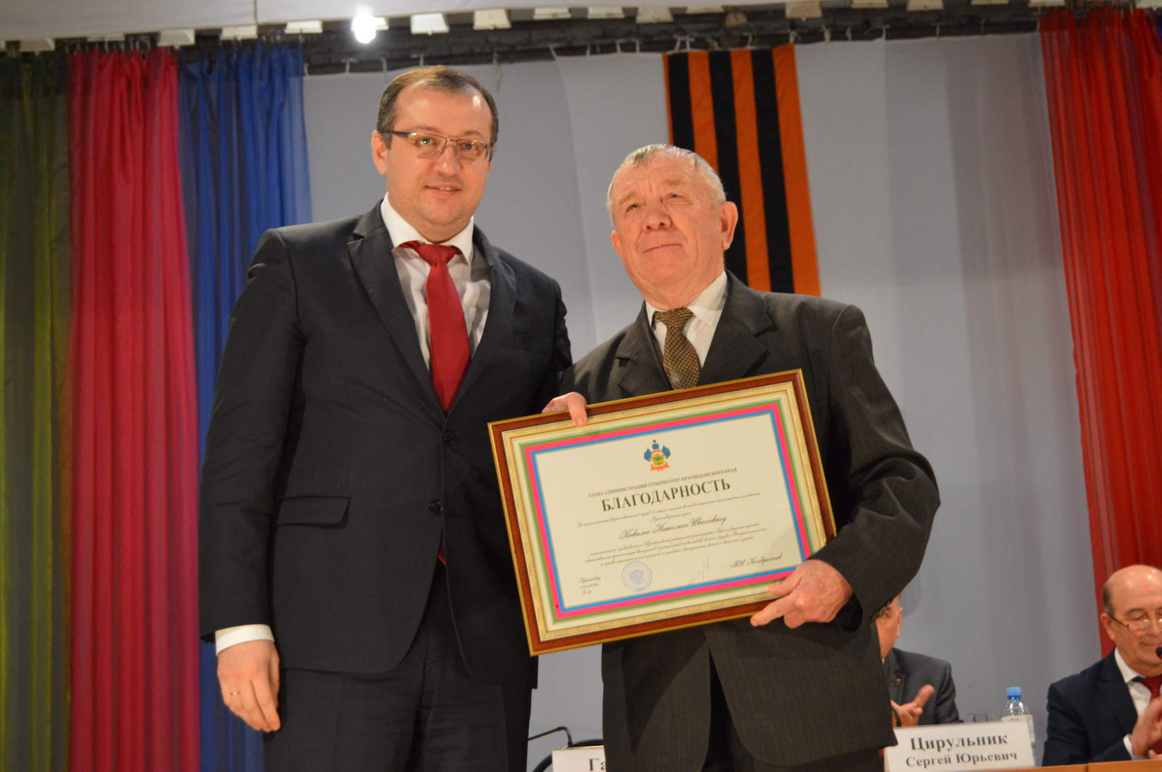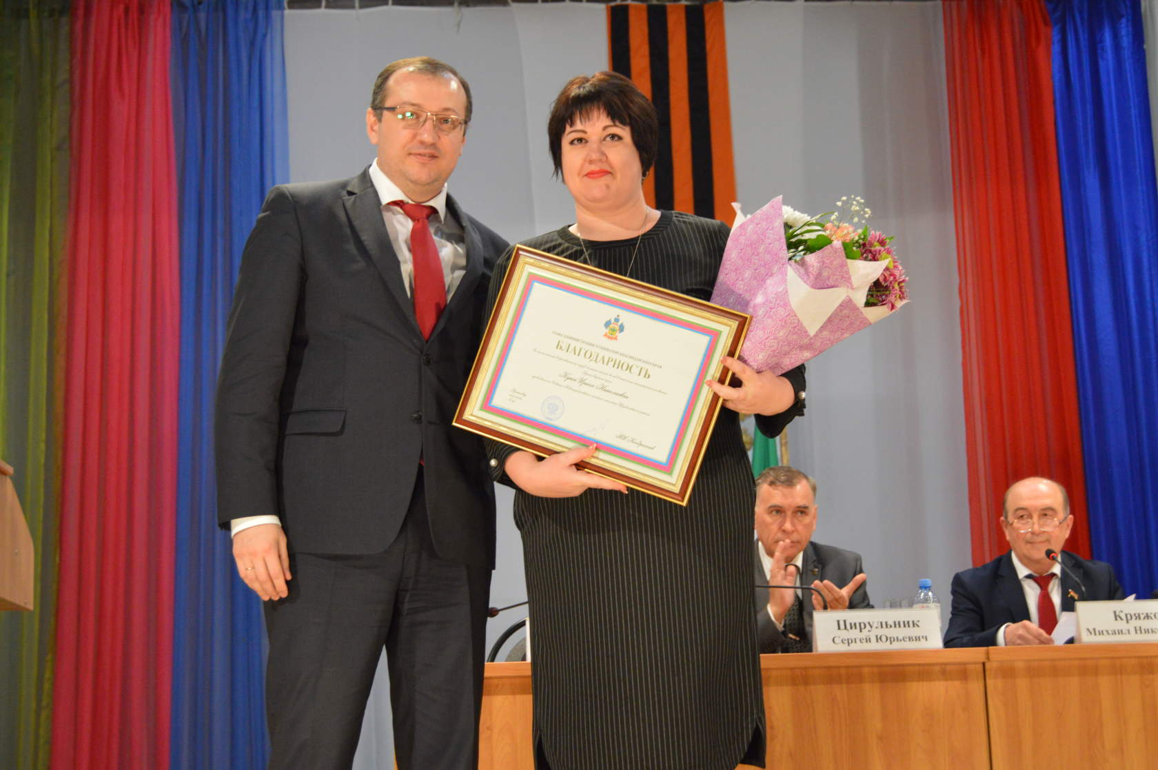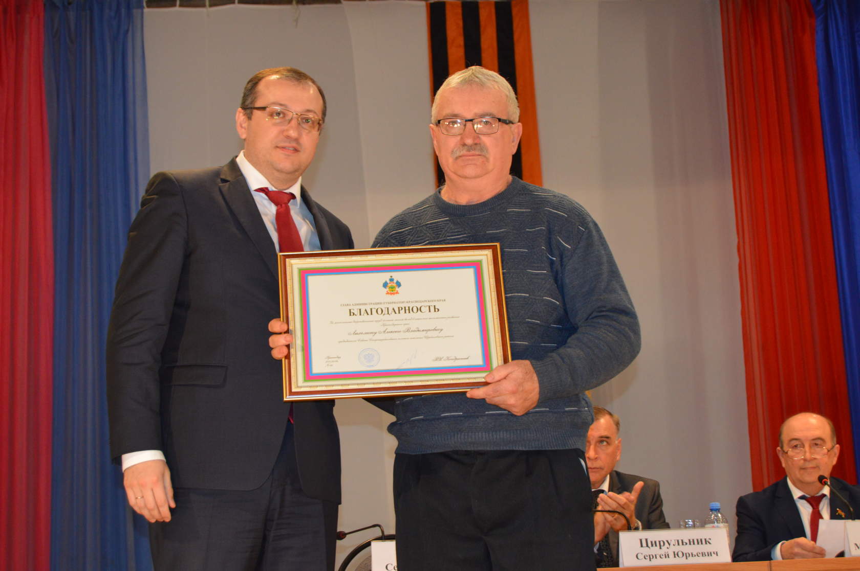 В конце заседания министр труда и социального развития Краснодарского края торжественно вручил благодарности главы администрации (губернатора) Краснодарского края. За многолетний добросовестный труд и большой личный вклад в развитие местного самоуправления в Краснодарском крае благодарностью губернатора были награждены заместитель председателя Щербиновского районного совета ветеранов Николай Коваль, председатель Совета Новощербиновского сельского поселения Ирина Кукса, председатель Совета Старощербиновского сельского поселения Алексей Лихолит.