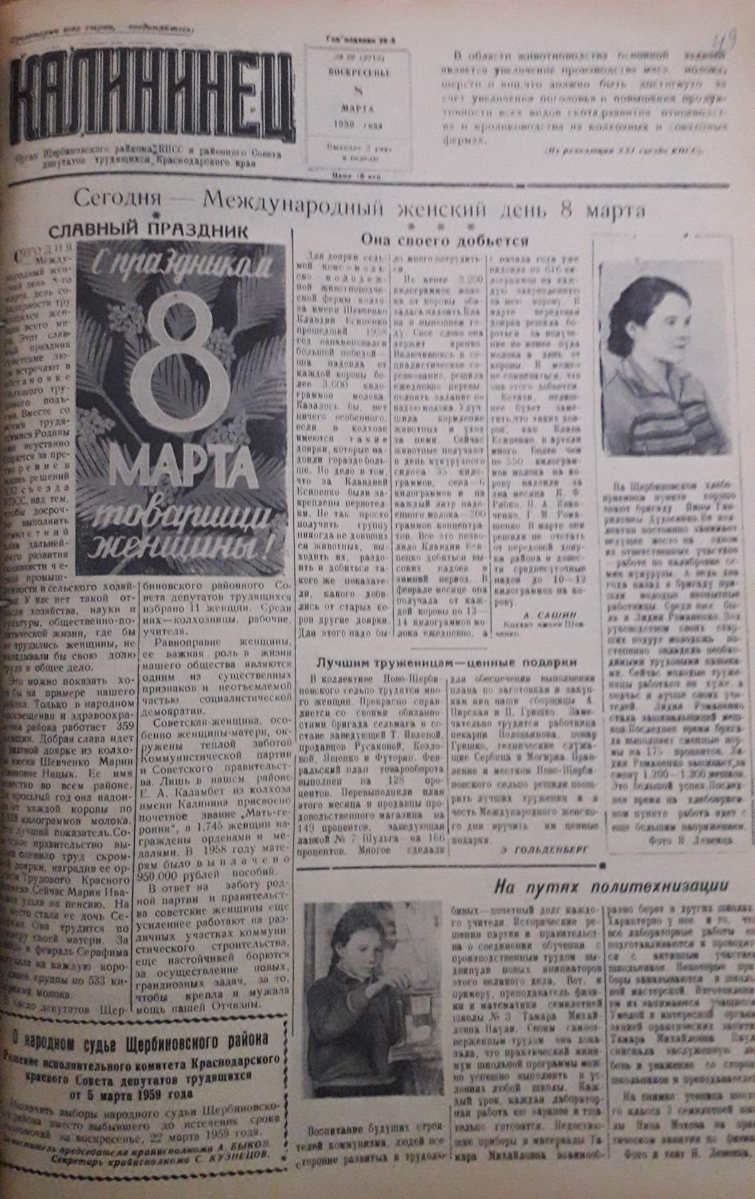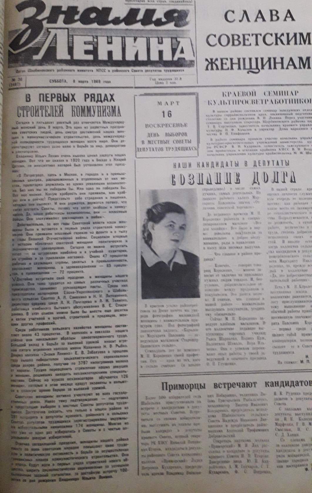 Проанализировав выпуски районной газеты за 1949, 1959, 1969,1979, 1989 и 1999 годы хочется отметить, что праздник 8 марта до 1999 года в прессе освещали очень скромно. В эти годы информация, посвященная женскому дню размещалась лишь на первых страницах газеты. И только в 1999 году «прекрасной половине человечества» был посвящен весь праздничный номер районной газеты. Специалистами архивного отдела подготовлена подборка из статей тех лет к 8 марта о женщинах передовиках.