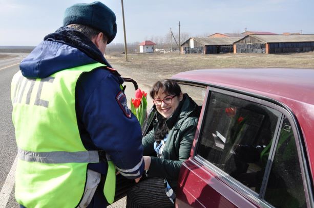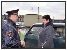 На плечи полицейских была возложена почётная и приятная миссия - вместо того, чтоб проверять документы, сегодня они останавливали машины, чтобы подарить сидящим за рулем женщинам цветы.