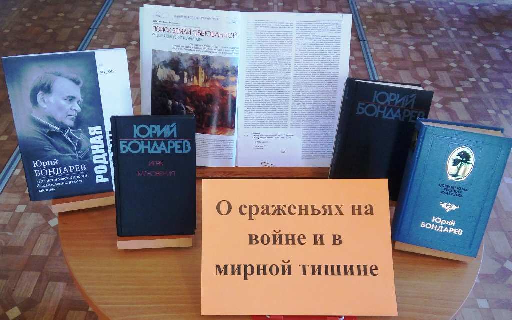 23 марта 2019 года в МКУК ЩМБ состоялся час литературного портрета «О сраженьях на войне и в мирной тишине», который был посвящен 95-летию писателя-фронтовика Юрию Бондареву. Цель: вызвать у читателей интерес к литературе на военную тему, к личности и творчеству Ю. Бондарева. Задача: рассказать о Ю. Бондареве, о его творчестве и его биографию. В ходе мероприятия слушатели познакомились с биографией писателя. Особое внимание было уделено обзору литературы, посвященной ВОВ. Звучали отрывки из повестей «Горячий снег», «Батальоны просят огня» и другие. Звучали стихи Д. Самойлова и А. Твардовского, посвященные Ю. Бондареву.