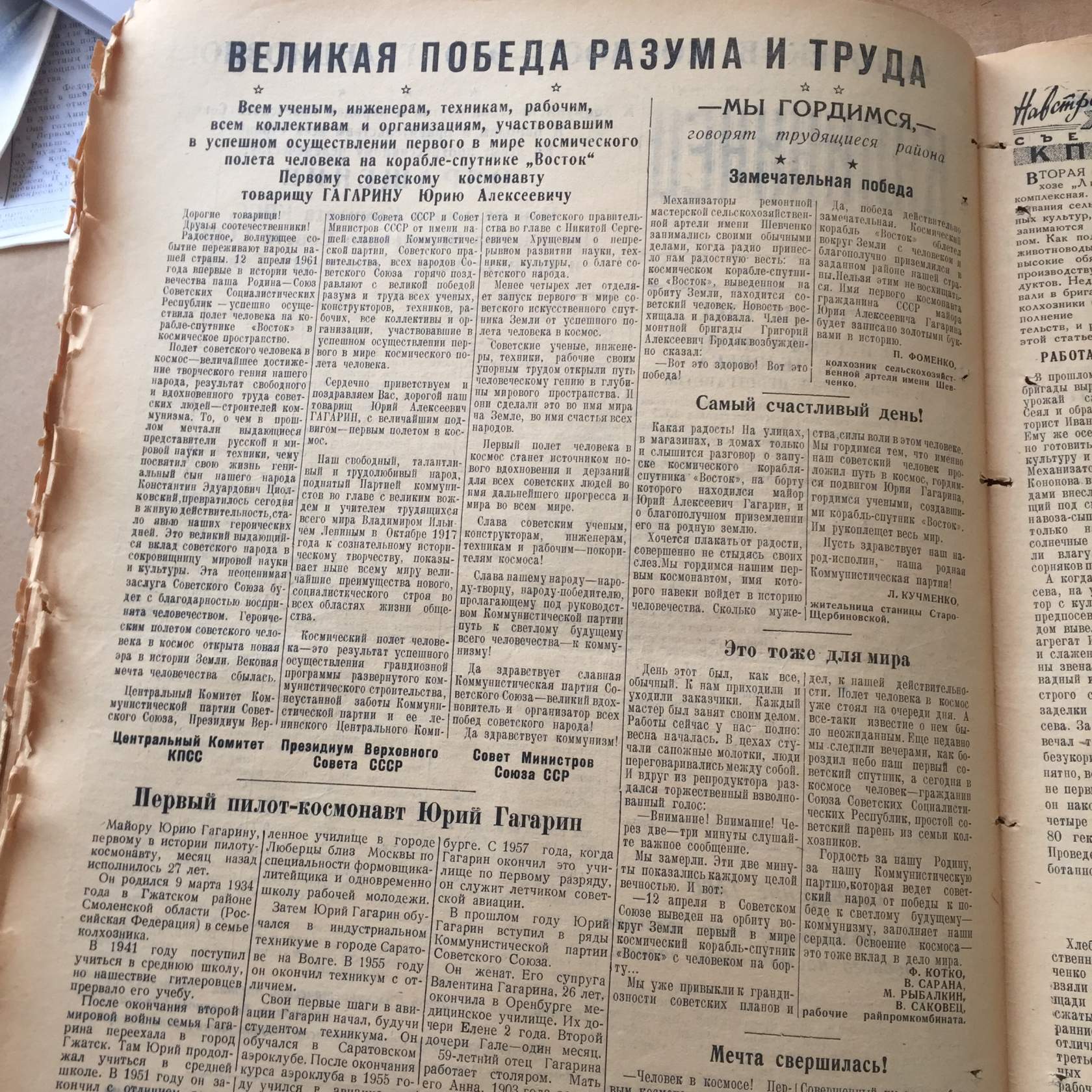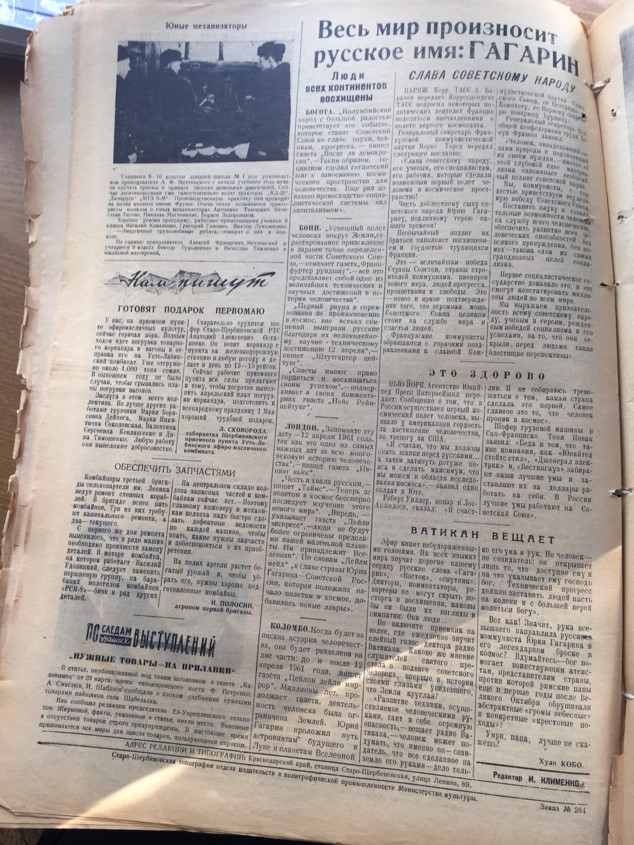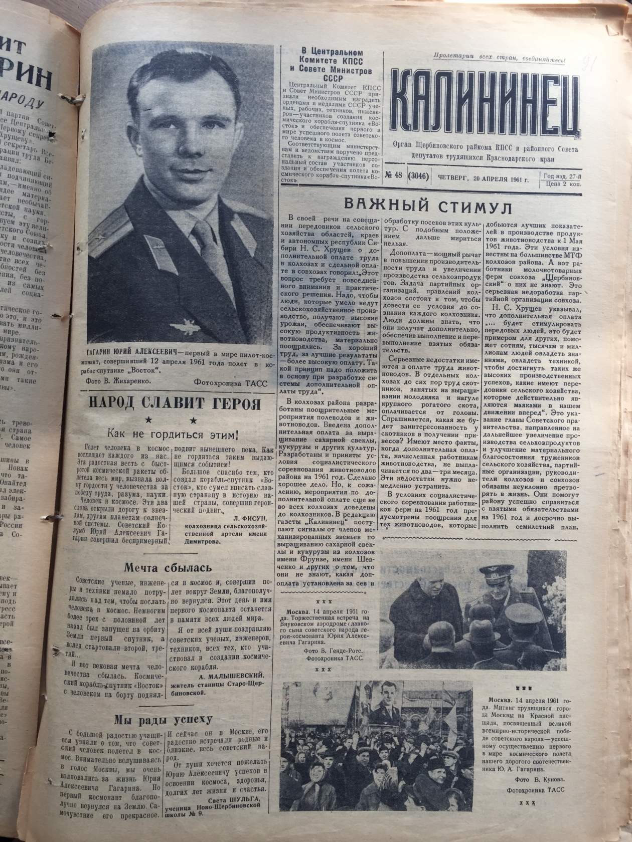 12 апреля 1961 года с космодрома «Байконур» впервые стартовал космический корабль, пилотируемый человеком. Юрий Гагарин, первый в истории летчик-космонавт, приобрел всемирную известность. Это событие имело эпохальное значение и открыло новые возможности для всего человечества, а первый полет человека в космос привлек внимание политиков и общественности всего мира. Космонавтом в то время мечтал стать каждый второй мальчишка. В архивном отделе администрации муниципального образования Щербиновский район сохранились номера районной газеты «Калининец» за апрель 1961 года, содержащие статьи о первом полете человека в космос.
