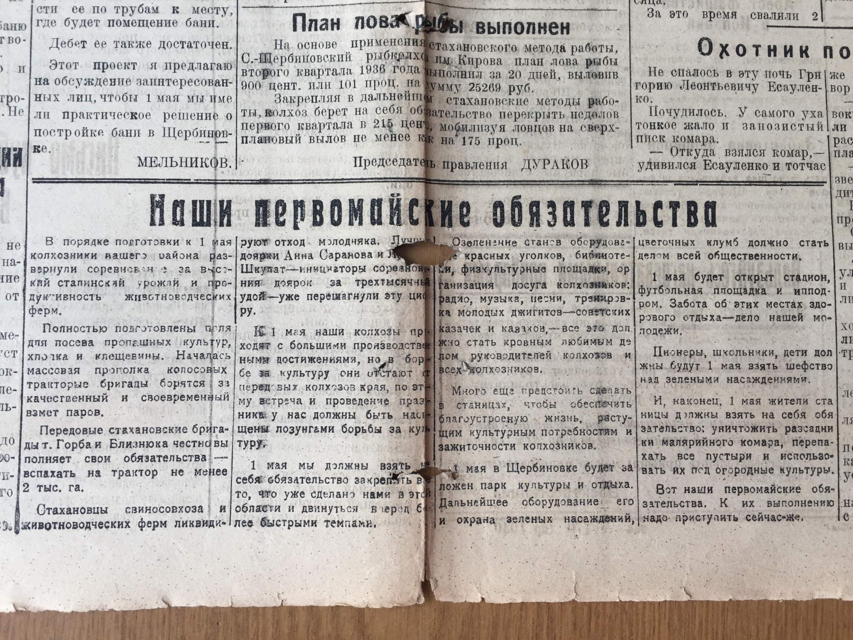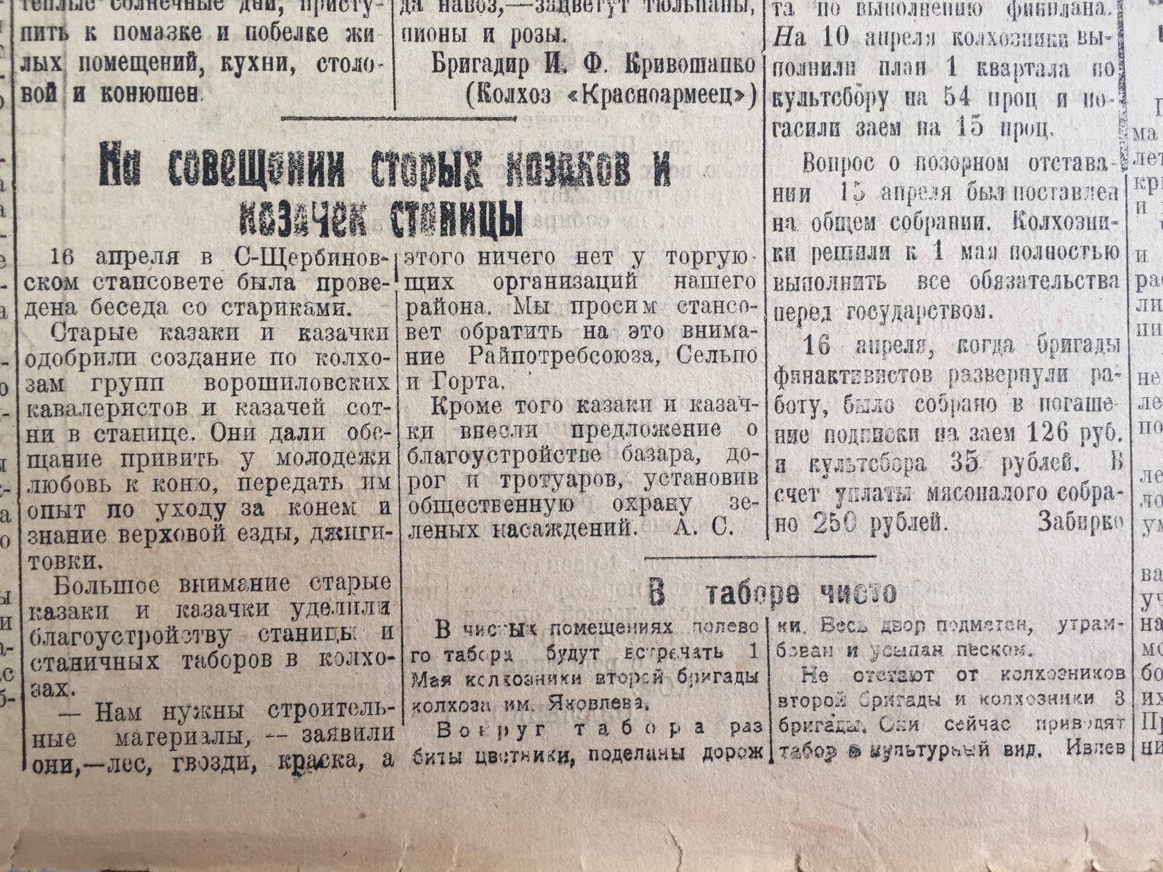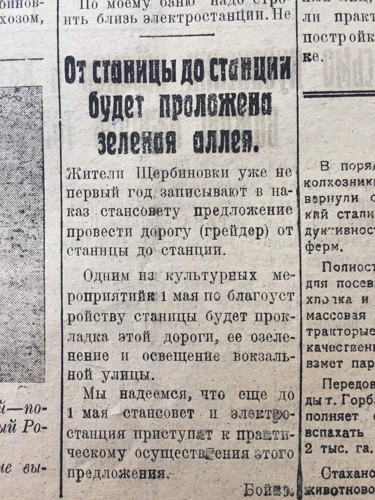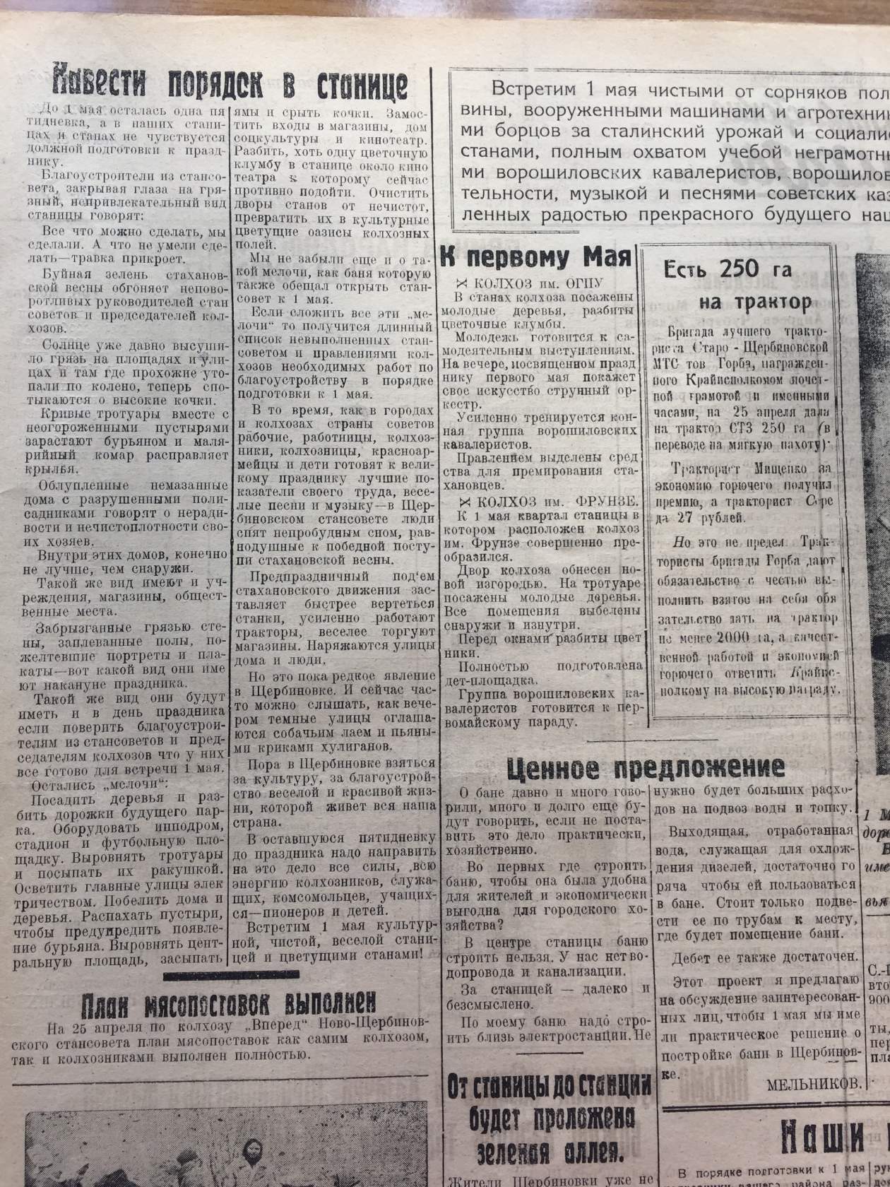 Апрель – время субботников. Мы помним, как в СССР ежегодно проводился Всесоюзный Ленинский коммунистический субботник. Сейчас мы принимаем участие во Всекубанском субботнике. Для всех жителей нашего района стало традицией благоустраивать свои придворовые территории именно в этот период: «к Пасхе» и к «Первомаю». В статьях районной газеты «За большевистские колхозы» содержится информация о том, как проводилось благоустройство наших сел и станиц в далеком 1936 году. Интересным является тот факт, что в рамках мероприятий по благоустройству 1 мая 1936 года на месте разрушенной Покровской церкви был заложен наш парк культуры и отдыха.