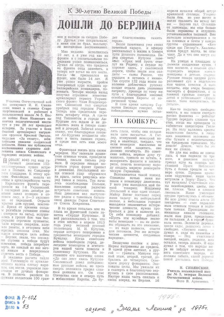 Сегодня в преддверии Великого дня Победы предлагаем познакомится с его статьей «Дошли до Берлина», которая опубликована в газете «Знамя Ленина» за 1975 год. Статья представлена воспоминаниями старшего лейтенанта запаса Синянского о последних неделях войны: