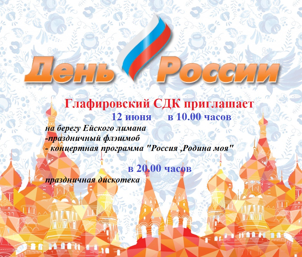 18.00- Праздничный концерт ко Дню России «Любовь к тебе, моя Россия» (Площадь Глафировского сельского дома культуры).