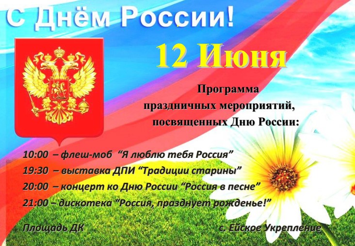 19.00- Праздничный концерт ко Дню России «Россия в песне» (Площадь Ейскоукрепленского сельского дома культуры)
