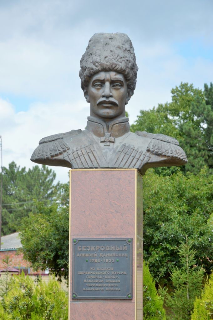 Знаменательное событие в жизни Щербиновского района произошло в мае 2008 года, когда на центральной площади установили бюст земляку наказному атаману Черноморского казачьего войска, генерал-майору Алексею Даниловичу Безкровному. Изготовил бюст в городе Анапе известный кубанский скульптор Поляков В.П.. затем формы были отправлены в г. Жуковск, где и отлили бюст героя Отечества.