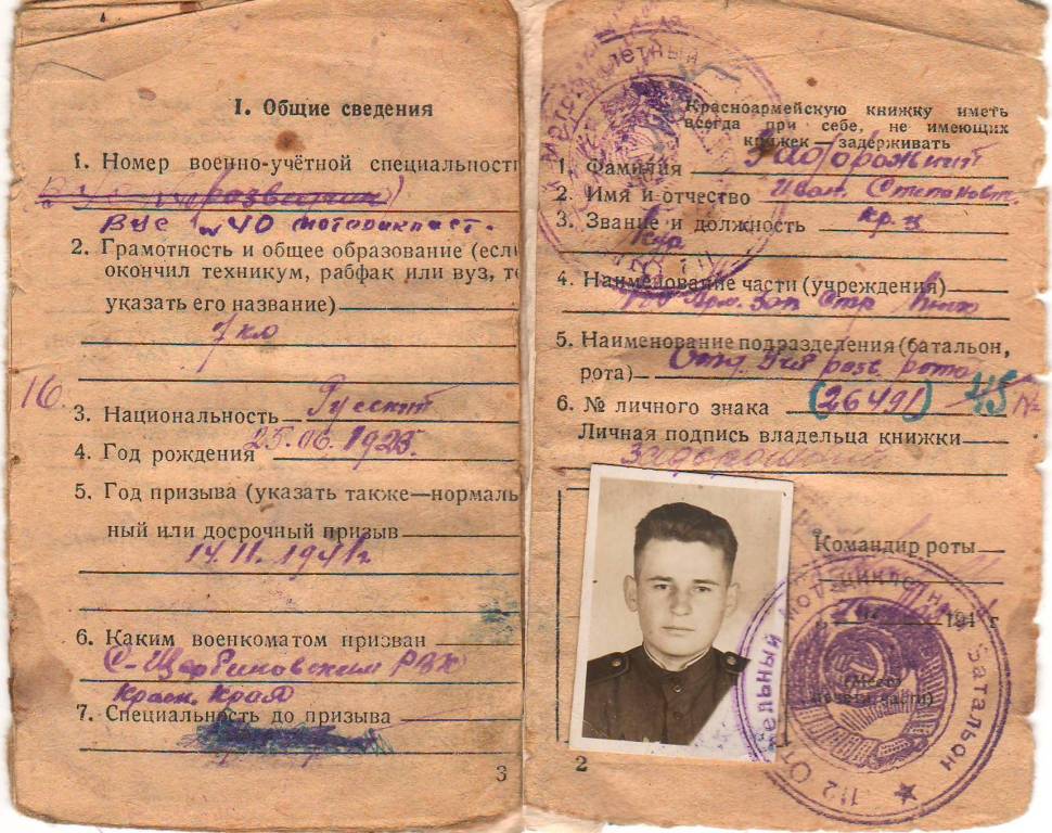 Хотелось бы обратить внимание на интересный документ Великой Отечественной войны – красноармейскую книжку. Маленькая, пожелтевшая от времени книжка красноармейца нашего земляка Ивана Задорожнего в кармане гимнастерки вмести с ним прошла всю войну. Выданная при призыве на фронт в ноябре 1941 года, она побывала в Берлине в мае 1945 года, вернулась домой в ст. Старощербиновскую и до наших дней бережно хранится потомками красноармейца Ивана Задорожнего.
