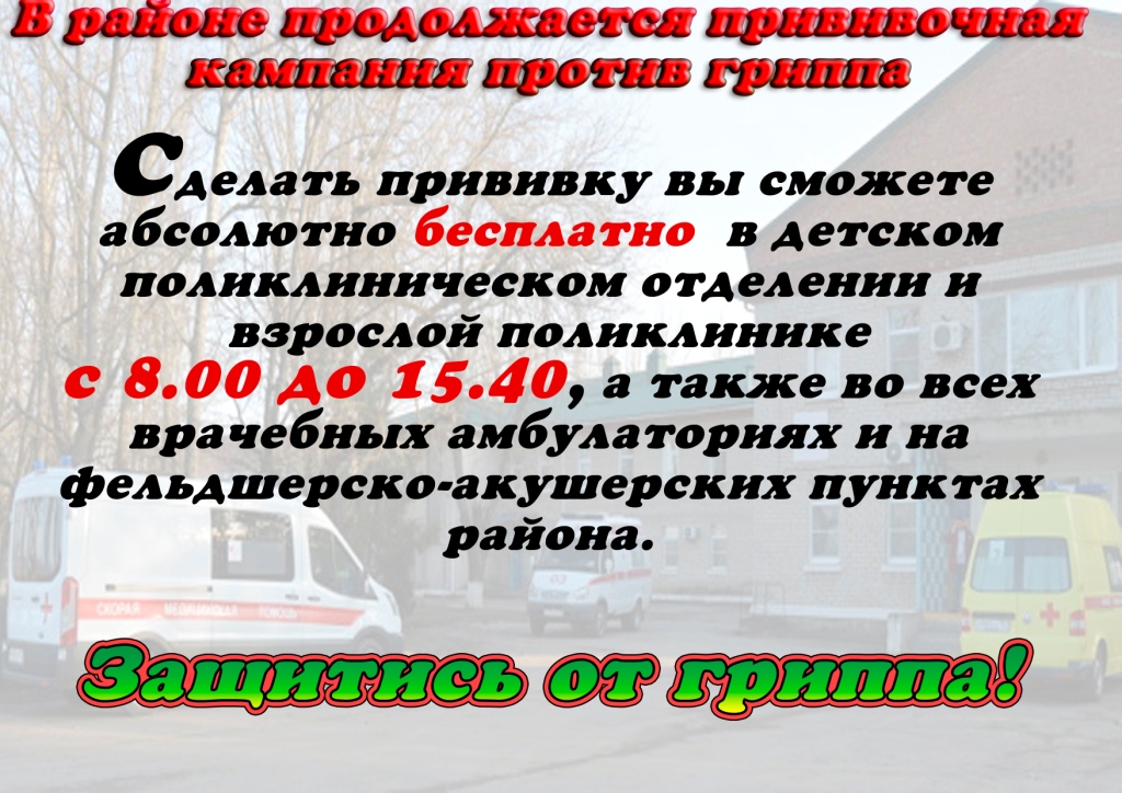 Уважаемые жители района! Обратите внимание на то, что в районе продолжается прививочная кампания против гриппа. "Сделать прививку вы сможете абсолютно бесплатно в детском поликлиническом отделении и взрослой поликлинике с 8.00 до 15.40, а также во всех врачебных амбулаториях и на фельдшерско-акушерских пунктах района. Для проведения прививки необходимо обратиться к своему участковому врачу», - прокомментировал главный врач районной больницы Иван Качура. Уважаемые земляки! Заранее позаботьтесь о своём здоровье!