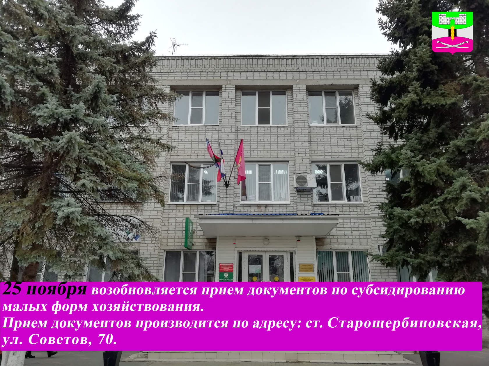 25 ноября возобновляется прием документов по субсидированию малых форм хозяйствования. Прием документов производится по адресу: ст. Старощербиновская, ул. Советов, 70. Приемные дни: понедельник – четверг с 8 до 15 часов, перерыв с 12 до 13 часов. Телефон для справок: 7-82-47.