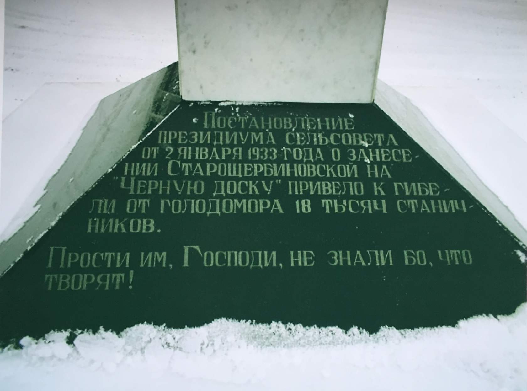 До голодомора в станице проживало 22,5 тысяч человек. Из них погибло от голода 18 тысяч человек, осталось в живых 2,5 тысячи. Именно такая цифра значится на гранитной плите памятного знака.