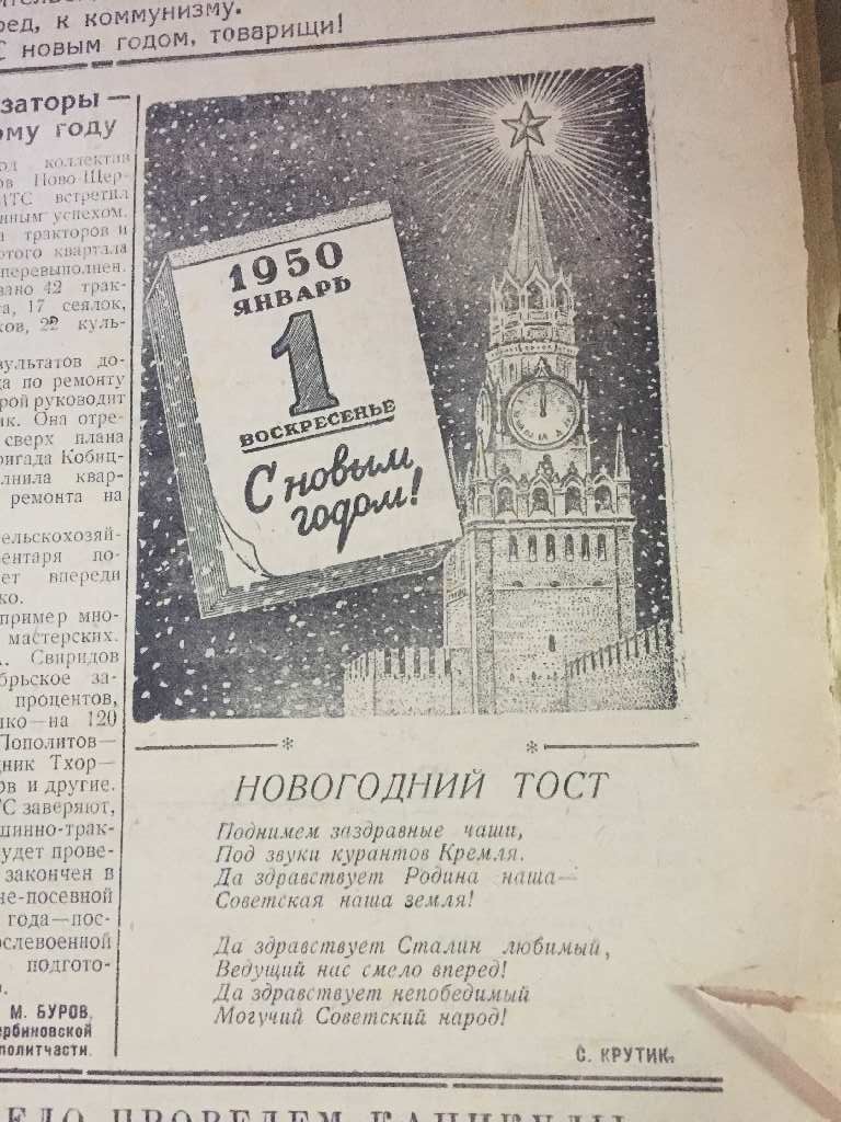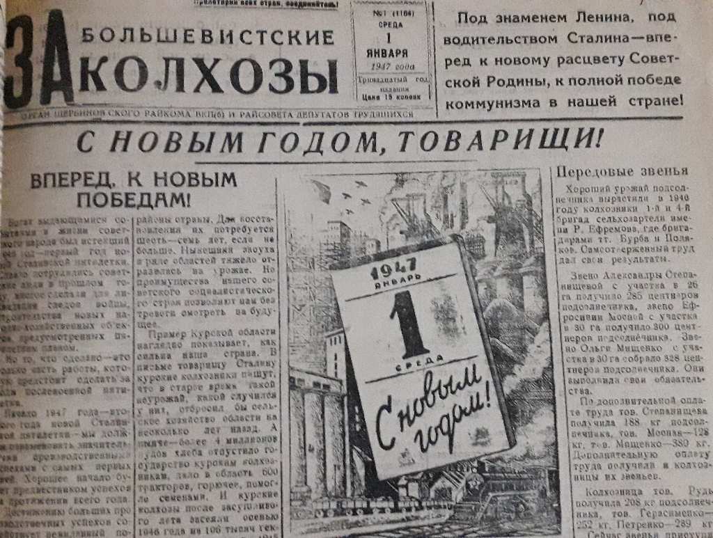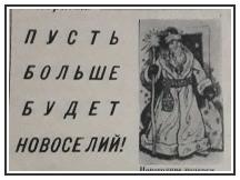 На новогодних иллюстрациях газет можно увидеть, какие достижения были в стране за год или пятилетку. Уникальна электронная копия почтовой карточки «БОЕВОЙ НОВОГОДНИЙ ПРИВЕТ С ФРОНТА», предоставленная председателем местного отделения РОИА Еленой Владимировной Жарковой. Эта карточка, направлена 29 декабря 1941 года красноармейцем Н.Анченко с фронта Великой Отчественной войны своей семье в село Ейское Укрепление. Листая старые газеты, мы понимаем, каким значимым событием всегда был для людей этот праздник.