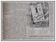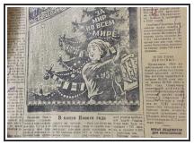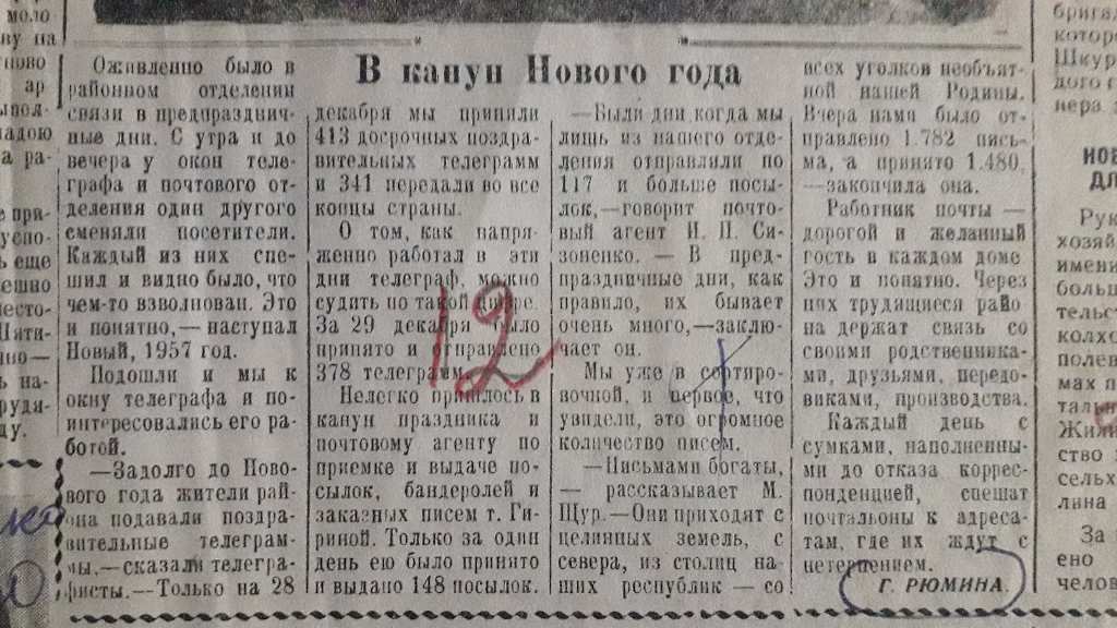 «…только 28 декабря приняли 413 досрочных поздравительных телеграмм и 341 предали во все концы страны. …… За 29 декабря было принято и отправлено 378 телеграмм. Нелегко пришлось в канун праздника и почтовому агенту по приемке и выдачи посылок, бандеролей и заказных писем т. Гириной. Только за один день ею было принято и выдано 148 посылок….. Мы уже в сортировочной, и первое, что увидели, это огромное количество писем. – Письмами богаты, - рассказывает М. Щур. – они приходят с целинных земель, из столиц наших республик - со всех уголков необъятной нашей Родины. Вчера нами было отправлено 1 782 письма, а принято 1480 - закончила она.».