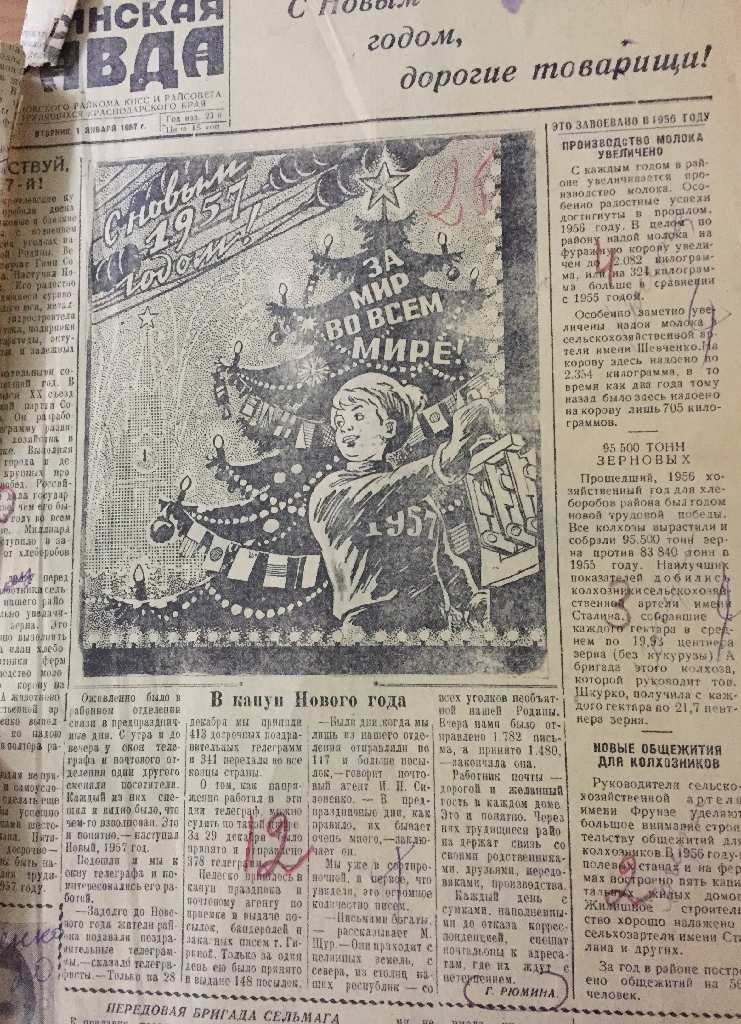 Новый год – волшебный, теплый и светлый праздник. О том, как щербиновцы готовились к встрече Нового года раньше можно узнать из нашей районной газеты. В преддверии праздника сотрудниками архивного отдела выполнена подборка интересных статей. Анализ районных газет за 1939, 1949, 1954, 1956, 1957, 1962, 1969, 1981, 1989 годы показал, что выпуски газеты были 30 декабря и 1 января. Это говорит о том, что у сотрудников редакции эти были не выходные дни, а рабочие. Из статьи газеты «За большевистские колхозы» от 15 декабря 1949 года «Первый каток» мы узнаем о том, что «…установились первые морозные дни и погода позволяет приступить к оборудованию катка, который строится на территории средней школы №1…». Интересна статья из газеты «Сталинская правда» № 1 от 01.01.1957 года «В канун Нового года», в которой рассказывается о работе почтового отделения: