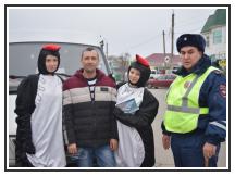 С пешеходами инспекторами проведена беседа о необходимости перехода проезжей части только в установленных местах, а также призвали пешеходов носить световозвращающие элементы на одежде для того, чтобы в пасмурную погоду или в вечернее время водитель издалека мог заметить пешехода. Кроме того инспекторы ДПС разъясняли участникам мероприятия административную ответственность за нарушения ими ПДД.