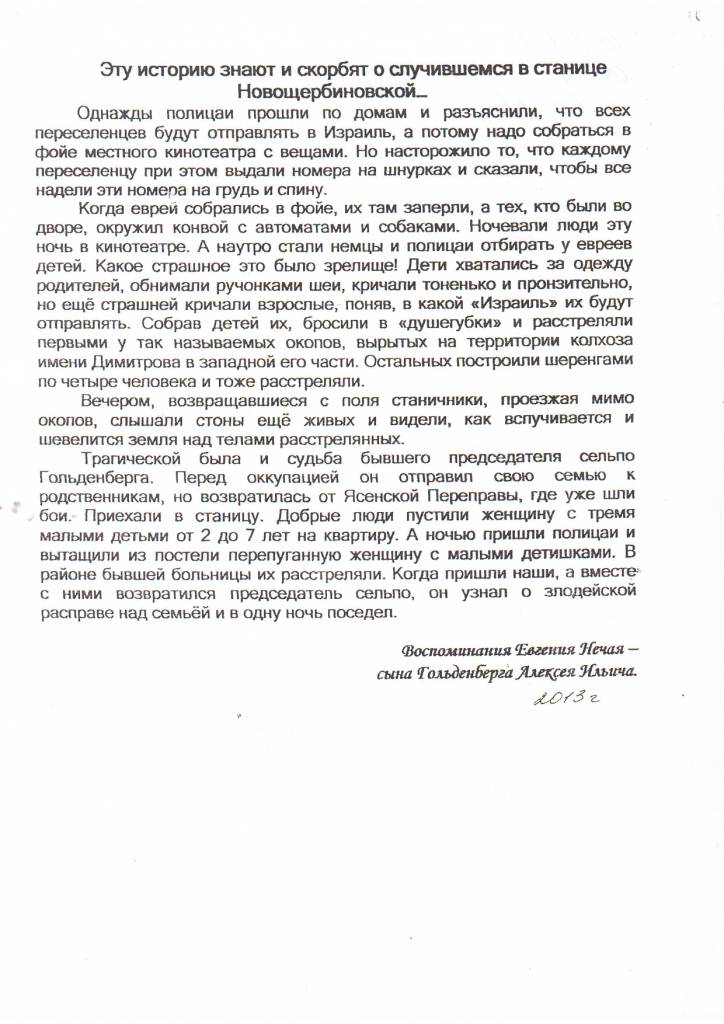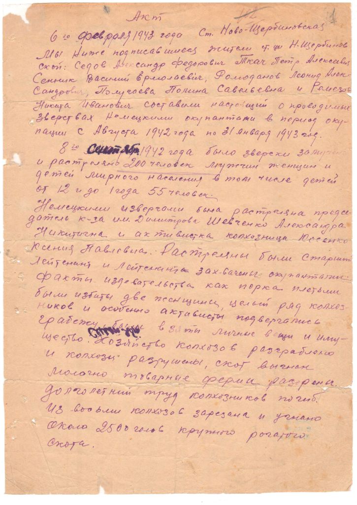 Информация предоставлена жительницей станицы Старощербиновской О.Л. Б…, 1960 года рождения, по воспоминаниям своих родственников – очевидцев событий оккупации Щербиновского района.