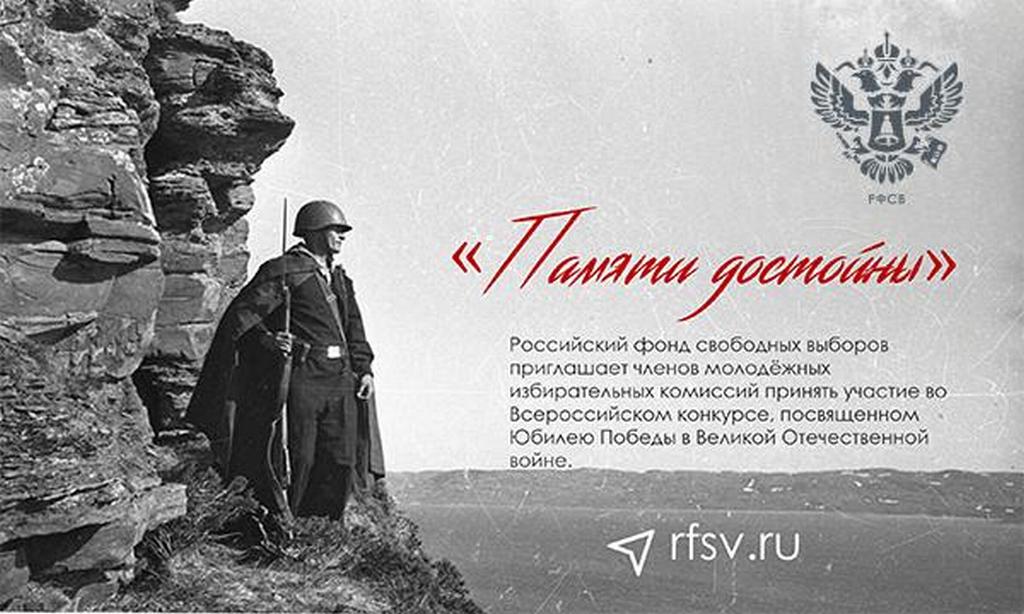 Территориальная избирательная комиссия Щербиновская приглашает членов молодёжных избирательных комиссий, членов Молодежного Общественного Совета при территориальной избирательной комиссии Щербиновская принять участие во Всероссийском конкурсе «Памяти достойны», посвященном Юбилею Победы в Великой Отечественной войне, организованном Российским фондом свободных выборов.