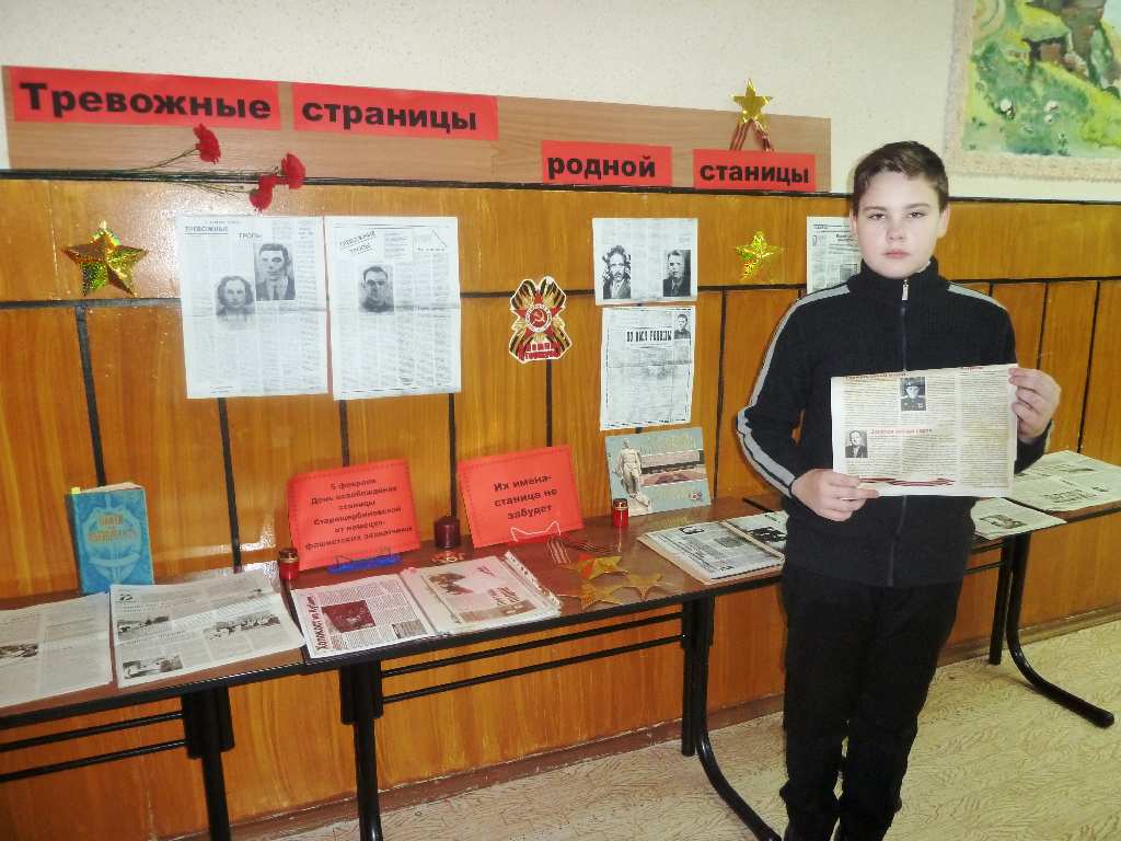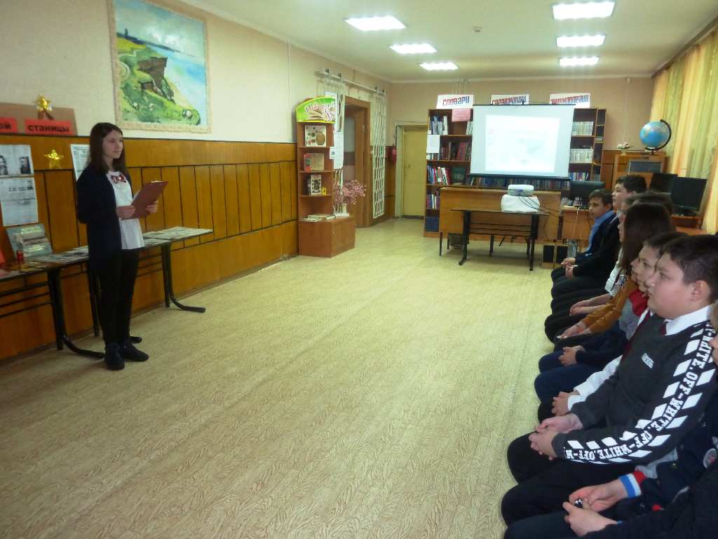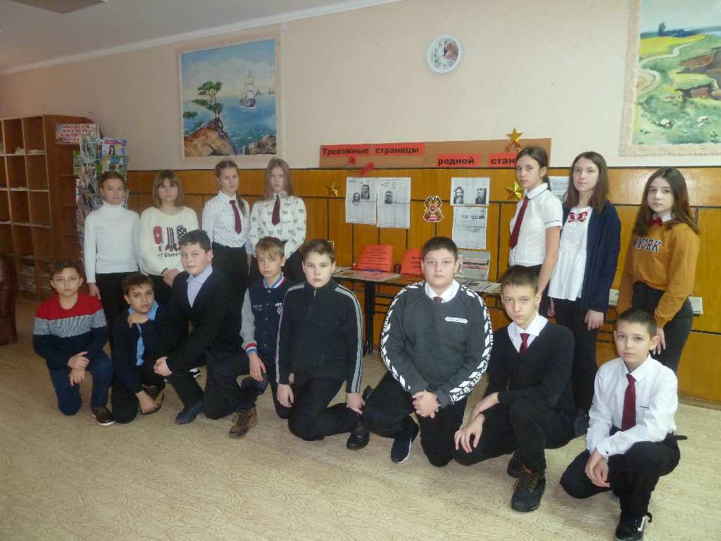 5 февраля, в день освобождения станицы Старощербиновской от немецко-фашистских захватчиков, в рамках месячника оборонно-массовой и военно-патриотической работы и культурного норматива школьника, в детской библиотеке состоялся рассказ - хроника «Тревожные страницы родной станицы», участниками которого стали ребята СОШ № 1 6 «А» класс. Библиотекарь рассказала учащимся об оккупации Кубани и Щербиновского района в 1942-1943 годах, а также о партизанском движении на Кубани. Отдельная страничка была посвящена щербиновским подпольщикам. Ребята узнали о руководителе щербиновского подполья А. А. Германе, о сестрах Наконечных и их брате Т. Наконечном, об учительнице Е.И. Гришко и ее 17-летнем сыне А. Гришко, о парторге Е. М. Вишняковой. Подпольщики вели подрывную деятельность на территории, занятой врагом: выясняли размещение и численность гарнизонов противника и карательных отрядов, взрывали железнодорожное полотно, склады оружия и боеприпасы, громили обозы, устраивали засады, печатали и расклеивали листовки, сообщали правду о положении дел на фронтах, призывали на борьбу с захватчиков своих земляков. Поразил ребят рассказ библиотекаря о мужестве арестованных подпольщиков, которые, несмотря на нечеловеческие пытки, выстояли, не отступили и не предали. Рассказ библиотекаря сопровождался показом слайдов презентации «Щербиновские подпольщики». В завершении мероприятия ребята познакомились с газетно - журнальным материалом с выставки «Их имена - станица не забудет».