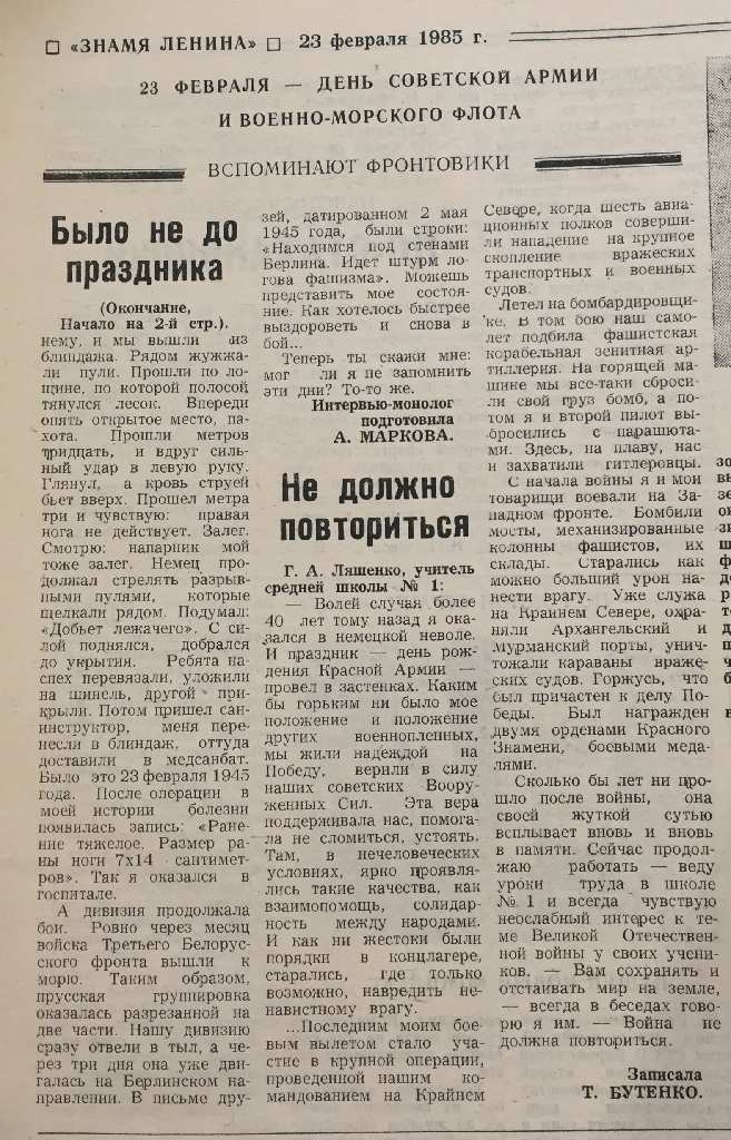 Листая районную газету «Знамя Ленина» за 1985 год, специалисты архивного отдела обнаружили интересные статьи о том, чем запомнился фронтовикам день 23-го февраля в 1945 году. Эти уникальные сведения сохранились в рубрике газеты «Вспоминают фронтовики», благодаря корреспондентам районной газеты Л. Арчаковой, А.Марковой и Т. Бутенко. При подготовке праздничного номера газеты к 23 февраля 1985 года, они встретились с ветеранами Великой Отечественной войны и догадались задать такой интересный вопрос.