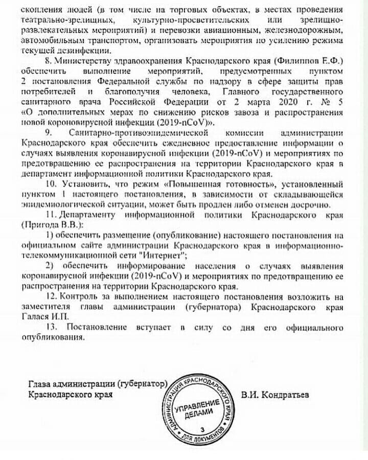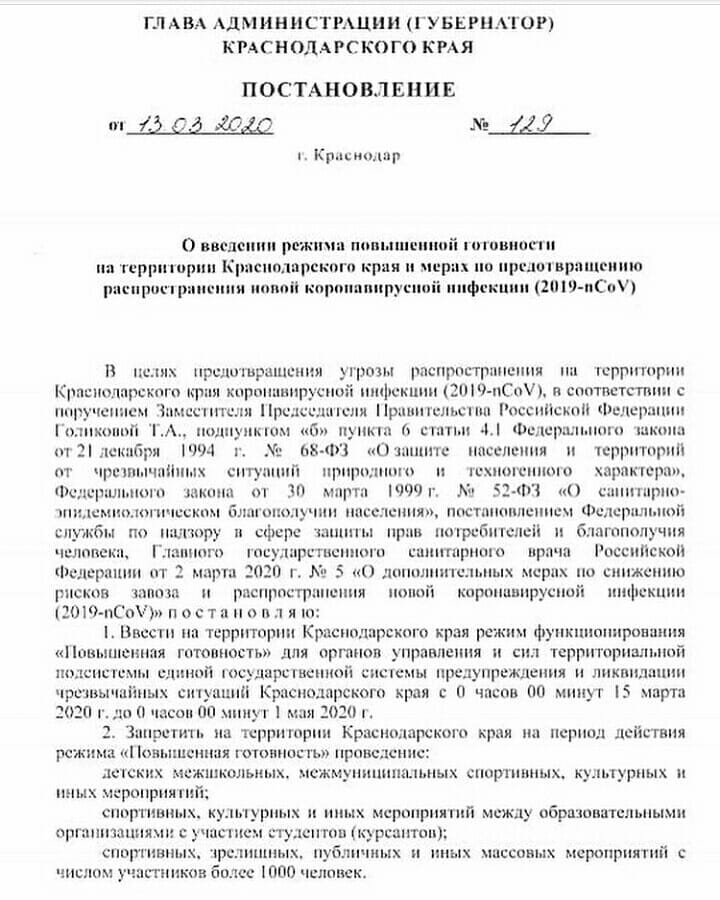 Глава региона Вениамин Кондратьев подписал постановление о введении режима повышенной готовности на территории края .