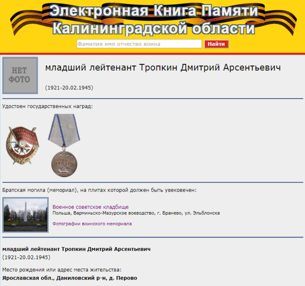 Информируем Вас о том, что по адресу: http://www.kpko.ru размещена электронная Книга памяти, мест захоронений советских воинов погибших на территории Калининградской области в годы Великой Отечественной войны. При планировании посещений мемориалов и захоронений Калининградской области, вы можете предварительно уточнить информацию о местах захоронений по вышеуказанному адресу.