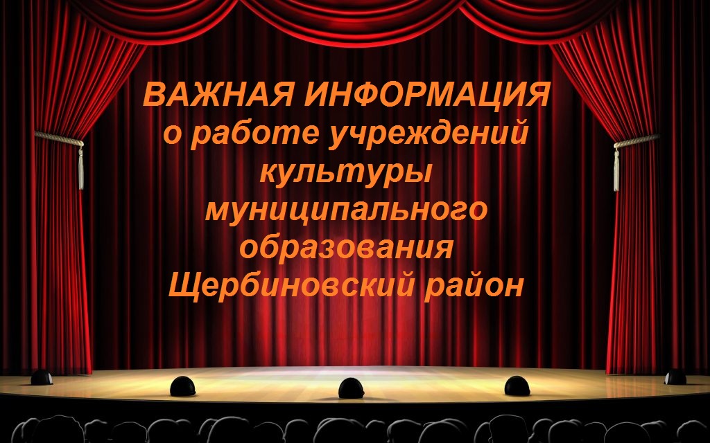 Несмотря на сложившуюся ситуацию с коронавирусной инфекции учреждения культуры Щербиновского района продолжают работу в онлайн – режиме. Родители и участники самодеятельных коллективов культурно – досуговых учреждений могут воспользоваться правом получения дистанционного обучения путём прямой трансляции с руководителем коллектива, либо путем видеоуроков. Ссылки на уроки будут публиковаться на сайтах учреждений и социальных страницах учреждений. Библиотеки муниципального образования временно приостанавливают обслуживание свыше 5 читателей одновременно, отменяют проведение всех массовых мероприятий с 18 марта 2020 года. Книги, уже прочитанные Вами, можно сдать дежурному библиотекарю. В самое ближайшее время на официальных сайтах учреждений культурыи на страничках в социальных сетях появится более подробная информация о новом направлении работы, будет опубликована афиша культурных мероприятий, которые будут транслироваться в виртуальном пространстве. Щербиновский центр кинодосуга и Старощербиновский историко – краеведческий музей им. М.М. Постернак продолжают свою работу в штатном режиме!
