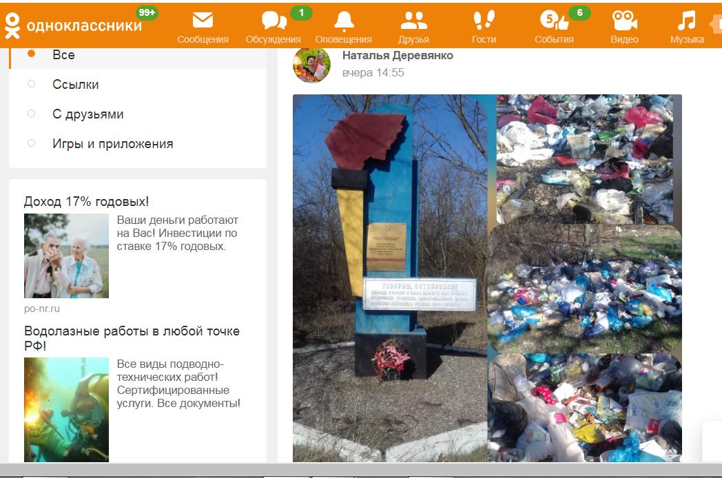 В социальной сети «Одноклассники» появилась запись от неравнодушной жительницы района о том, что возле братской могилы мирных жителей, расстрелянных фашистскими оккупантами, в станице Старощербиновской выброшены «горы» мусора. На эту информацию оперативно отреагировал глава Старощербиновского сельского поселения Владимир Подолянко. Вывезено 3 телеги мусора. Найдены документы, справки. Сейчас ведётся работа по поиску жителей, которые выбросили мусор. Люди делают уже свалки на кладбище, возле памятников, у некоторых людей уже ничего нет святого… Благодарим неравнодушных жителей, которые помогают узнать о таких фактах, Владимира Григорьевича за слаженную и результативную работу.