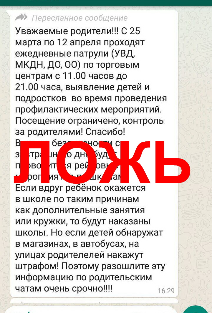 Рассылают сообщения о привлечении к ответственности за нахождение детей одних на улице,. Эта информация не соответствует действительности и носит фейковый характер.Напоминаем, что за распространение в средствах массовой информации и в сети Интернет заведомо недостоверной общественно значимой информации под видом достоверных сообщений, создающей угрозу нарушения общественного порядка и безопасности, предусмотрена административная ответственность. Кроме того, провокационные действия в общественных местах создателей подобных материалов могут содержать признаки преступления, предусмотренного статьей 213 УК РФ «Хулиганство», что влечет уголовную ответственность. МВД России призывает граждан внимательно относится к публикуемой в сети Интернет и мессенджерах информации, ориентироваться на официальные источники.