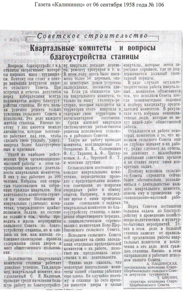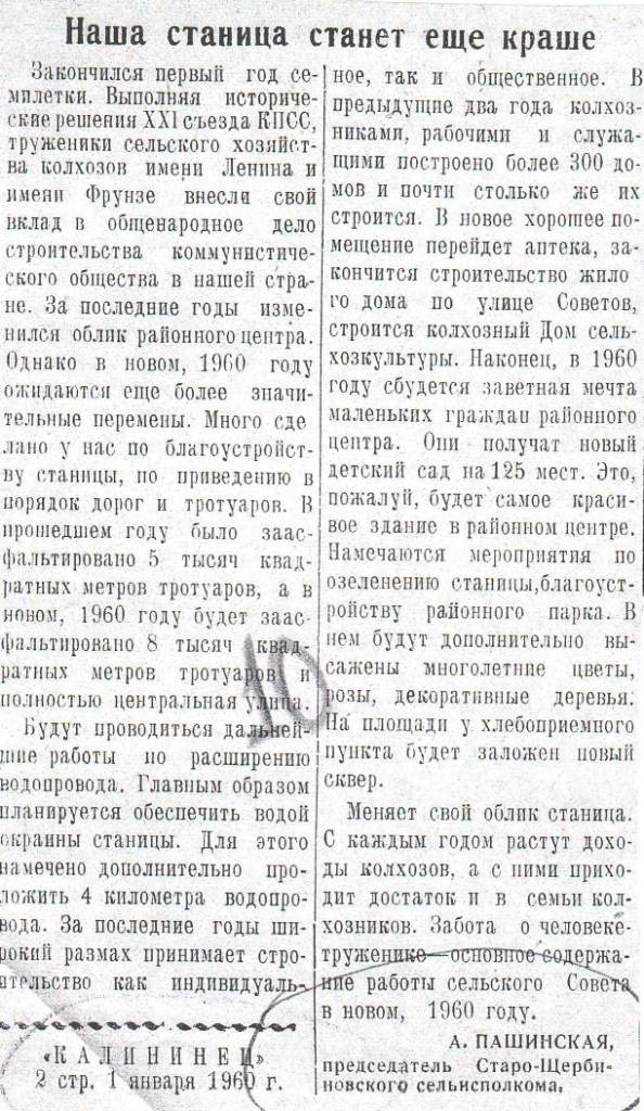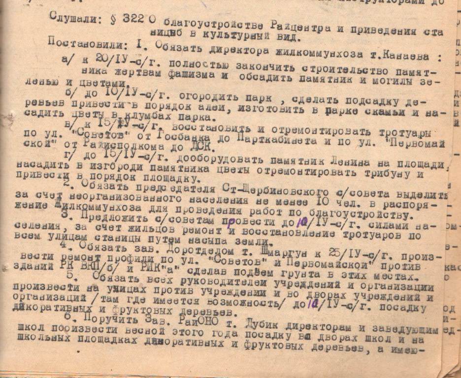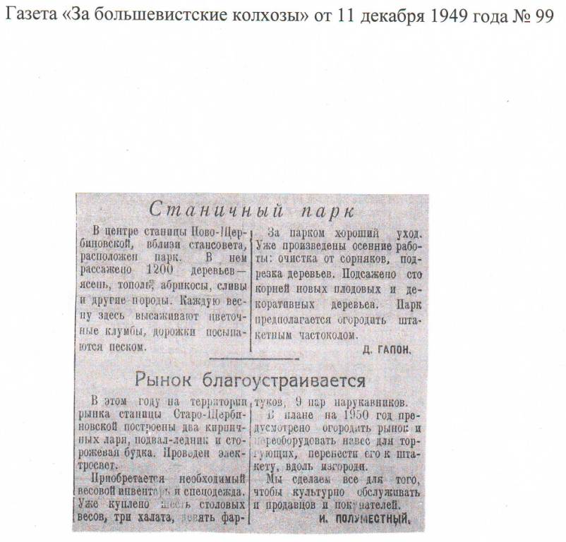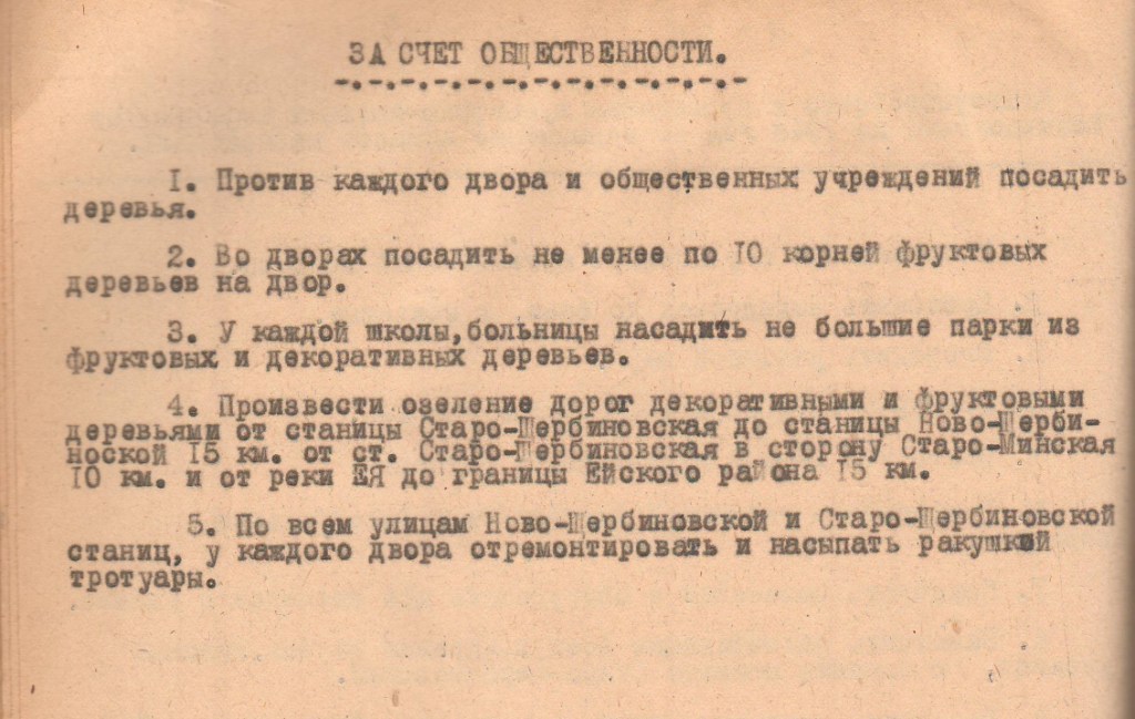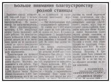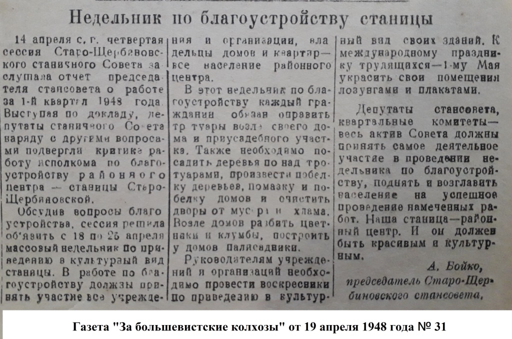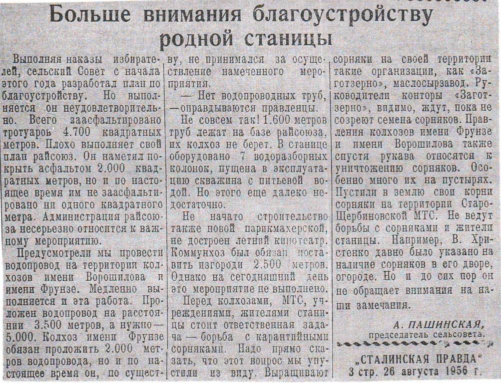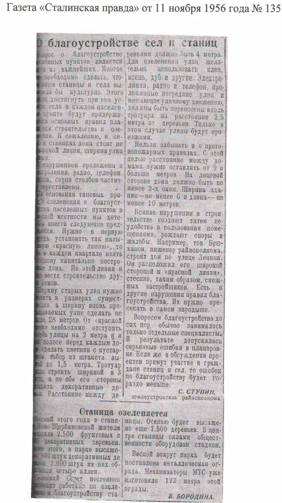 Листая старые районные газеты, мы видим, как во все времена наши станичники заботились о благоустройстве станицы и приведении ее в культурный вид (ф.Р-16, оп.1, д.2,13; ф.Р-102, оп.1, д.1,5,6,7,17,18,25,28)