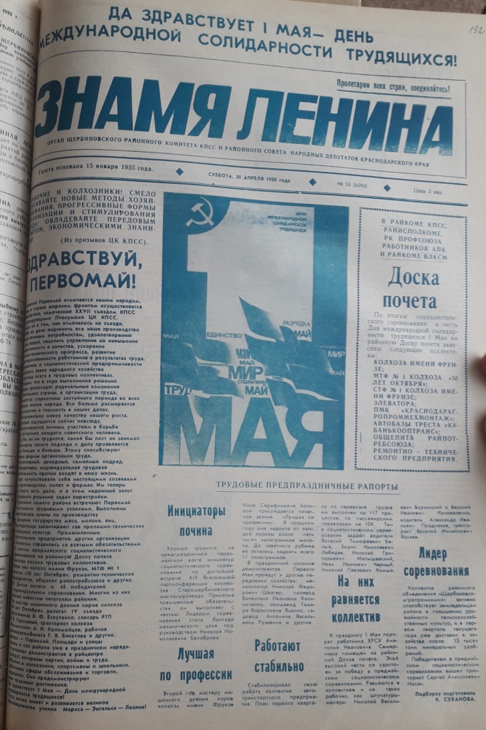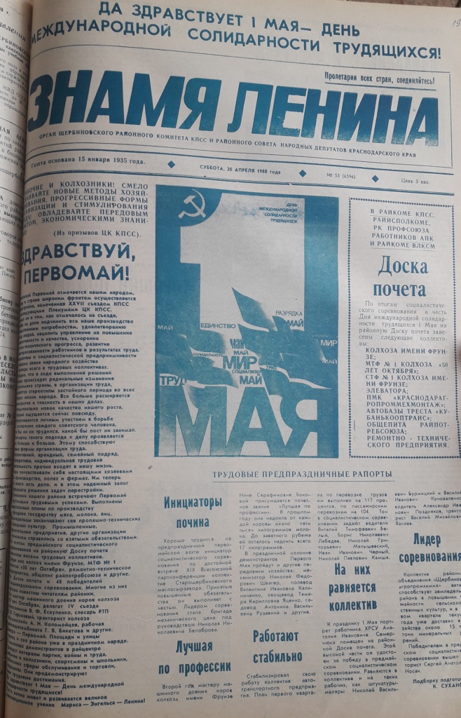 Специалистами архивного отдела подготовлена подборка из статей газет «Знамя Ленина» от 30.04.1988 года и от 29.04.1989 года, в которых рассказывается о праздновании 1 мая. Хочется обратить внимание, что традиционно в этот день проводили демонстрации, открывали и обновляли доску почета.