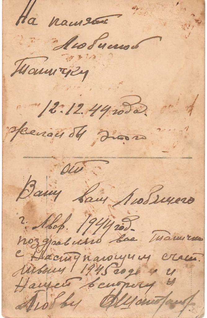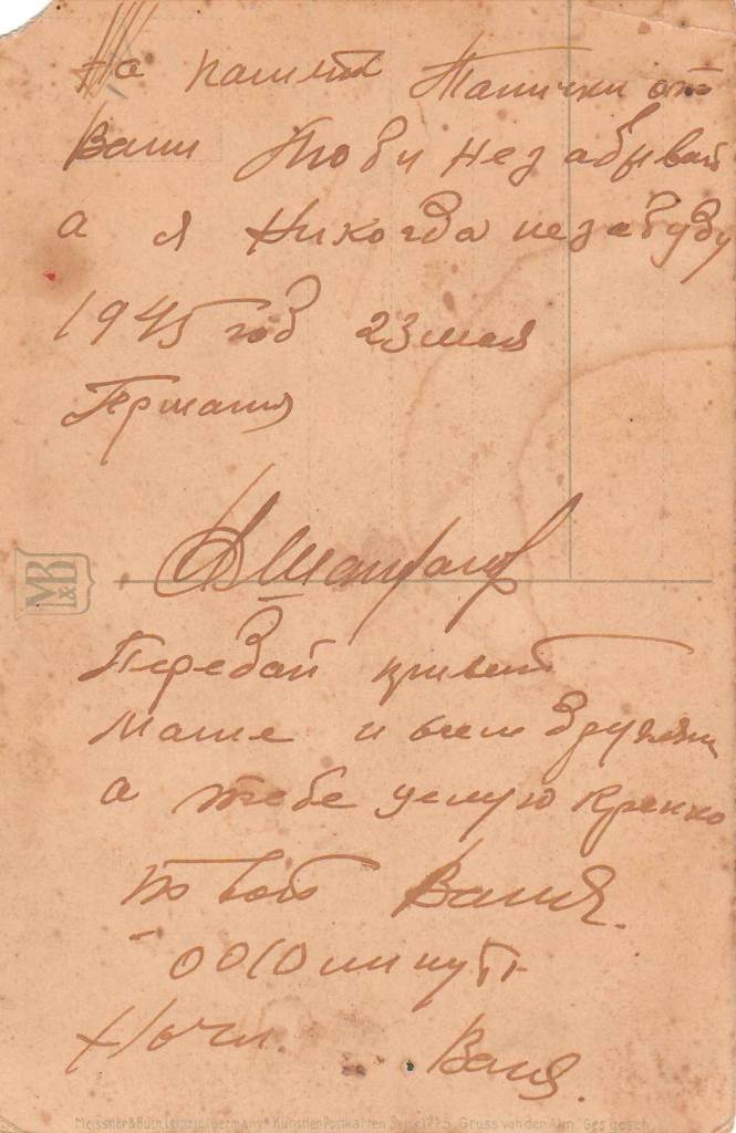 Надпись на обороте другой открытки: «На память Таничке от Вани. Люби, не забывай, а я никогда не забуду. 1945 г. 23 мая. Германия» (документы собственной собирательной деятельности архивного отдела администрации муниципального образования Щербиновский район)