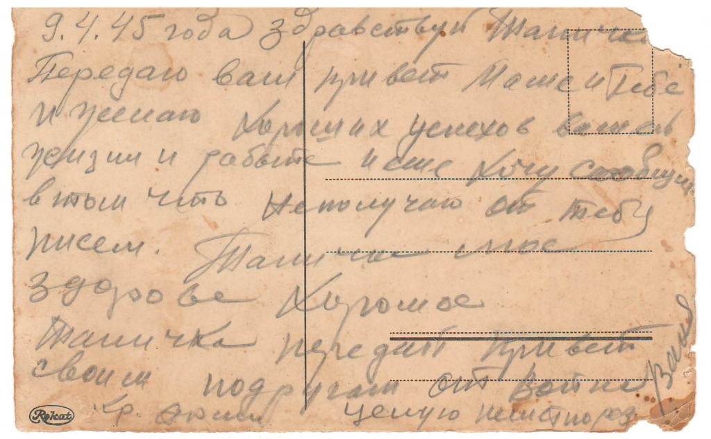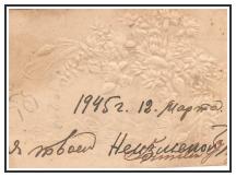 . Удивительно, что на одной из открыток изображение сирени, ставшей для нас символом Победы, и дата – 9 апреля 1945 года. Ровно месяц до дня окончания войны. До глубины души трогают слова солдата на обороте открытки: «9.4.45 года. Здравствуй, Таничка! Передаю вам привет Маше и тебе и желаю хороших успехов в вашей жизни и работе. И еще хочу сообщить о том, что не получаю от тебя писем. Таничка, мое здоровье хорошее. Таничка, передай привет своим подругам от бойца Кр.армии. Целую несчетно раз. Ваня.».