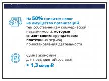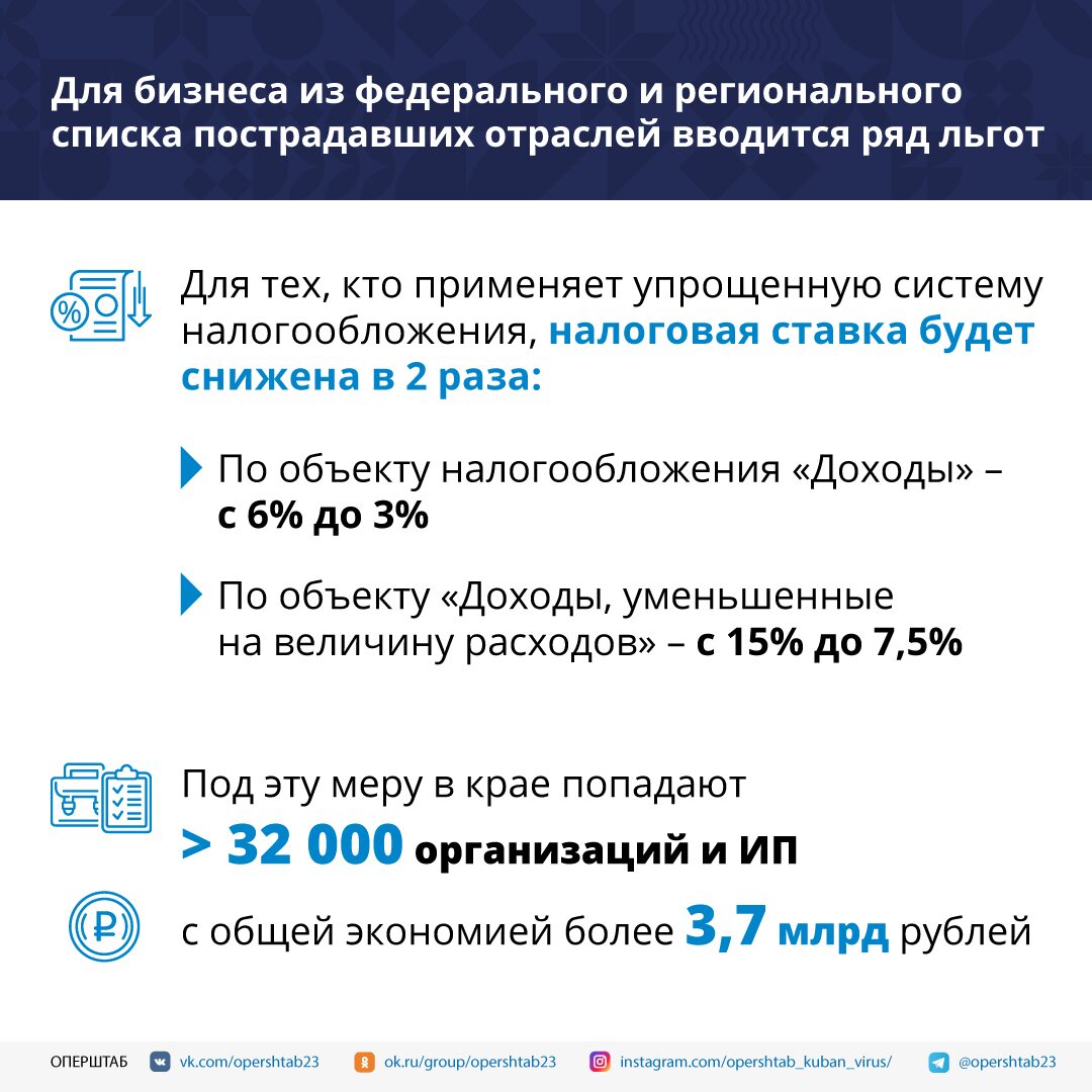 Речь идет об организациях и индивидуальных предпринимателях из федерального и регионального перечня отраслей, наиболее пострадавших от коронавируса. Это уже третий пакет экономических мер поддержки, применяемый в крае. Предложения по снижению обязательных платежей обсудили на заседании оперативного штаба по предупреждению и распространению коронавирусной инфекции, которое провел Вениамин Кондратьев. Для организаций и индивидуальных предпринимателей вводится ряд льгот: Во-первых, для тех, кто применяет упрощенную систему налогообложения, налоговая ставка будет снижена в два раза. По объекту налогообложения «Доходы» – с 6% до 3%. По объекту «Доходы, уменьшенные на величину расходов» – с 15% до 7,5%. Под эту меру в крае попадают более 32 тысячи организаций и индивидуальных предпринимателей. Их экономия на выплате составит более 3,7 млрд рублей. Во-вторых, в два раза будет снижена ставка по единому налогу на вмененный доход – с 15% до 7,5%. Этой мерой смогут воспользоваться более 49 тысяч организаций и предпринимателей. Экономия для них составит порядка 1 млрд рублей. В-третьих, предлагается снизить налог на имущество организаций на 50% тем собственникам коммерческой недвижимости, которые выполнят обязательства перед своими арендаторами в части снижения арендных платежей на период приостановления деятельности. Сумма составит более 1,3 млрд рублей.