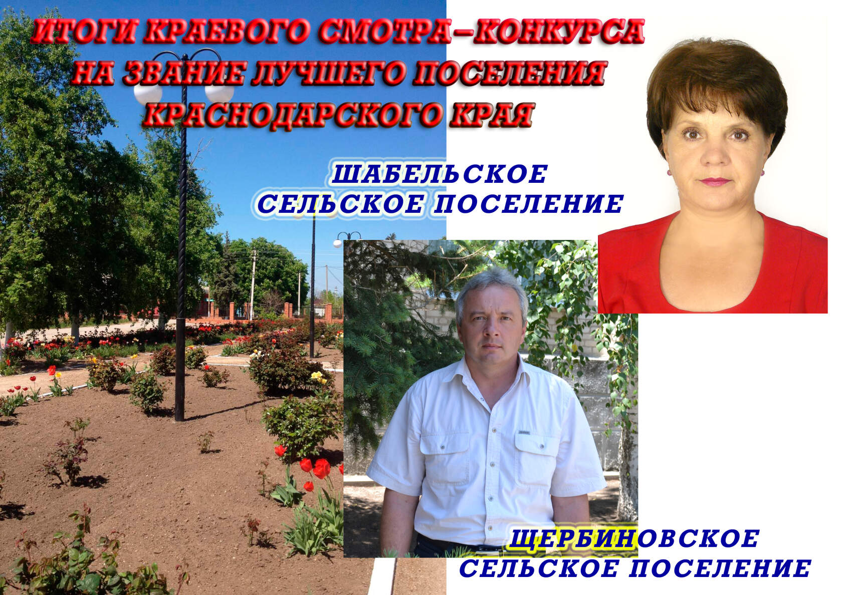 По итогам краевого смотра-конкурса на звание лучшего поселения Краснодарского края в 2019 году 3 место в группе «поселения с численностью населения от 1,7 до 2,2 тысячи человек» заняло Щербиновское сельское поселение, глава поселения Ченокалов Дмитрий Александрович. Первое место в группе «поселения с численностью населения от 2,2 до 3 тысяч человек» заняло Шабельское сельское поселение, глава поселения Бутко Зинаида Николаевна.