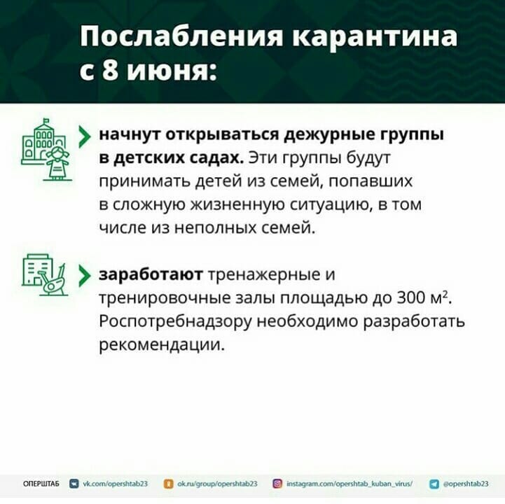 Также заработают спортивные стадионы для тренировок. При этом, по словам Марии Потемкиной, нужно будет соблюдать социальную дистанцию в 5 метров. С 8 июня откроются и спортивные залы площадью до 300 кв. метров. Загрузка объекта должна составлять не более 25%.