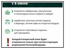 С 6 июня заработают уличные летние террасы и веранды, летние кафе на открытом воздухе с отдельным входом. При этом необходимо строгое соблюдение социальной дистанции и всех требований Роспотребнадзора.